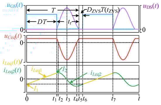 For the simplest equivalent model of the single-switch circuit shown in Figure 6c, the circuit operational waveform is depicted in Figure 7.