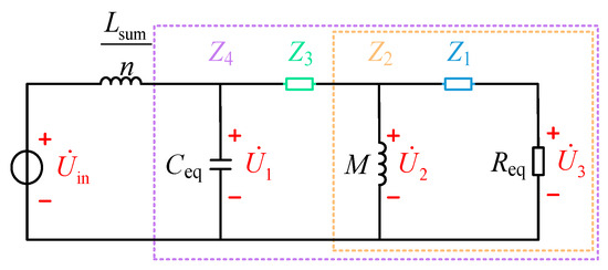 The fundamental-frequency equivalent model of the circuit topology shown in Figure 1 is illustrated in Figure 2, where Req denotes the equivalent resistance of the load resistor Rload after the rectifier bridge [33], satisfying the following: