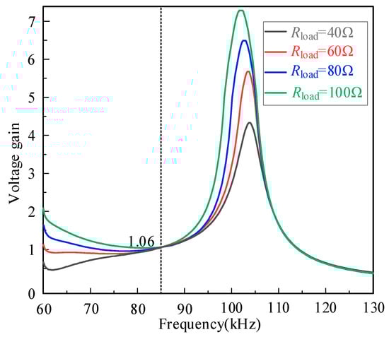 Figure 10 demonstrates the gain under changing load conditions. It can be observed that when the system operates at the resonant frequency of 85 kHz, the gain is the same under different loads, verifying that the system can maintain a constant voltage characteristic at 85 kHz.