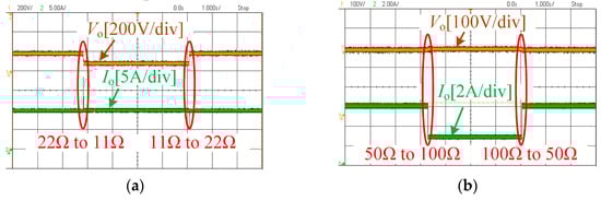 Figure 20 presents the efficiency curves during the charging process at the following two voltage levels: (a) represents the 220 V output, and (b) represents the 330 V output. It can be observed that as the charging process progresses, the efficiency initially increases and then decreases with the equivalent resistance of the battery. The maximum efficiency is achieved at the CC to CV transition points (22 Ω and 32 Ω).