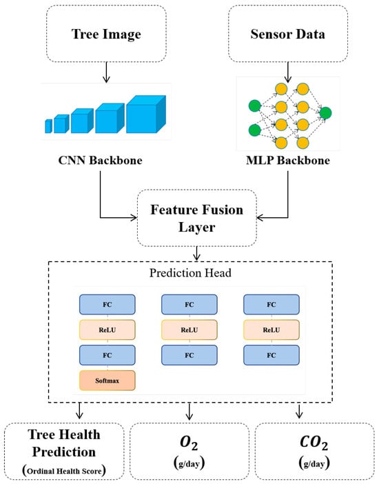 The model is trained in a multi-task learning paradigm, simultaneously addressing three prediction objectives; classification of tree health condition into discrete ordinal classes, regression of daily oxygen production, and regression of daily carbon dioxide absorption, as shown in Figure 4 and Figure 5.