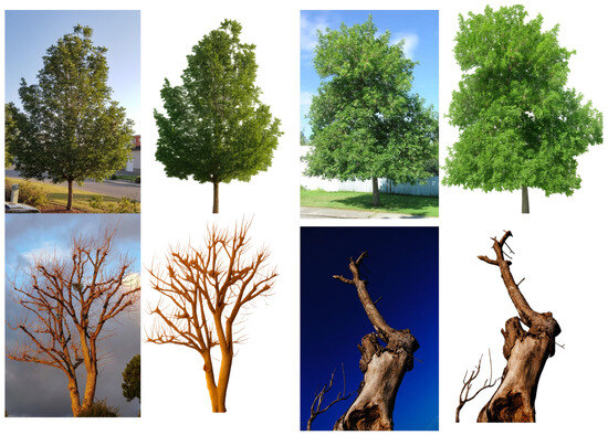 The background-removal step shown in Figure 3 is applied to isolate the tree structure from its surrounding environment. In uncontrolled outdoor conditions, raw images often contain highly variable backgrounds such as buildings, cars, pedestrians, sky, and shadows. These background elements introduce unwanted noise and can mislead the vision encoder, causing it to learn correlations unrelated to the actual physiological condition of the tree. By removing background pixels through semantic segmentation, we ensure that the model focuses exclusively on the trunk, branches, and canopy morphology. This process reduces sensitivity to lighting variations and environmental clutter, improves feature consistency across different acquisition sites, and enhances the generalization of the image encoder. Furthermore, background subtraction ensures that the multimodal fusion emphasizes meaningful visual cues rather than incidental context. This preprocessing step has been empirically shown to increase classification accuracy and regression stability, particularly for rare species and images captured in dense urban areas.