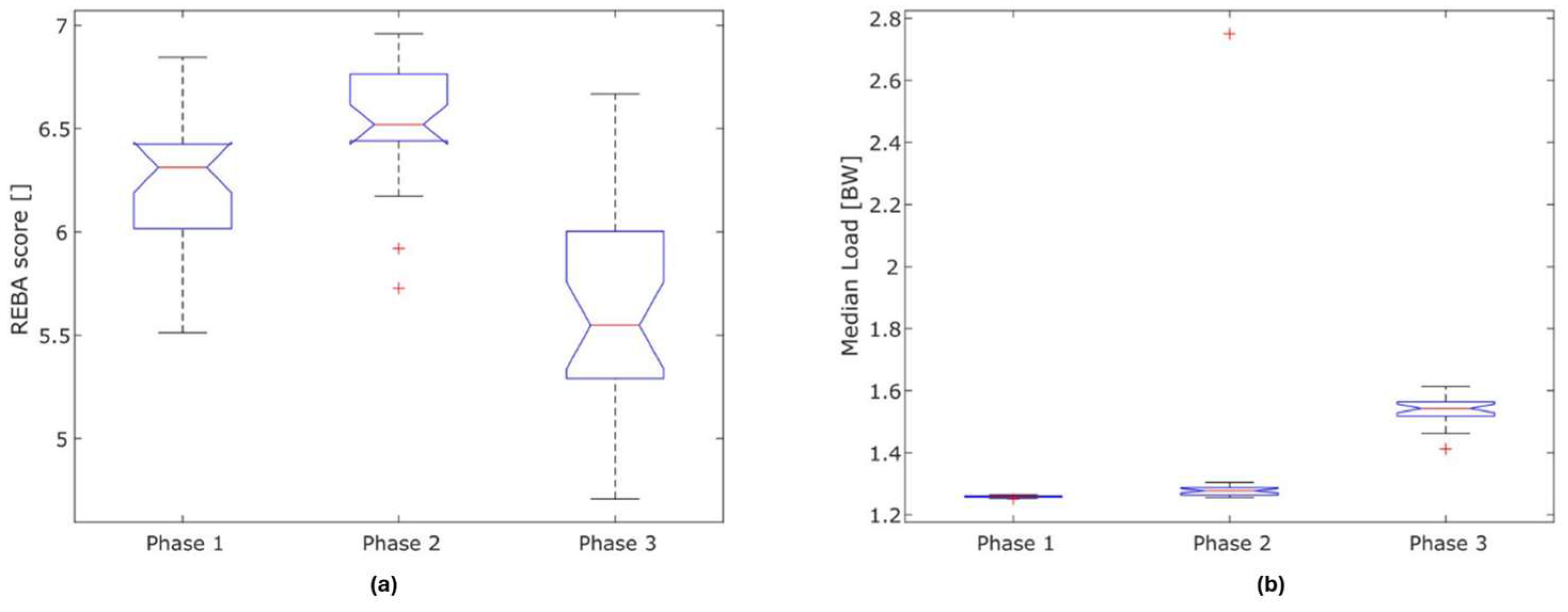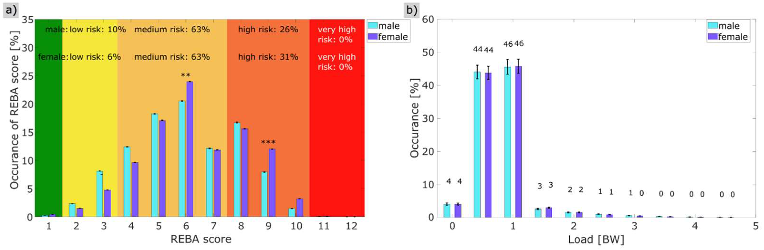 3.2. Phase-Specific REBA Score and Load Taking Gender into Account