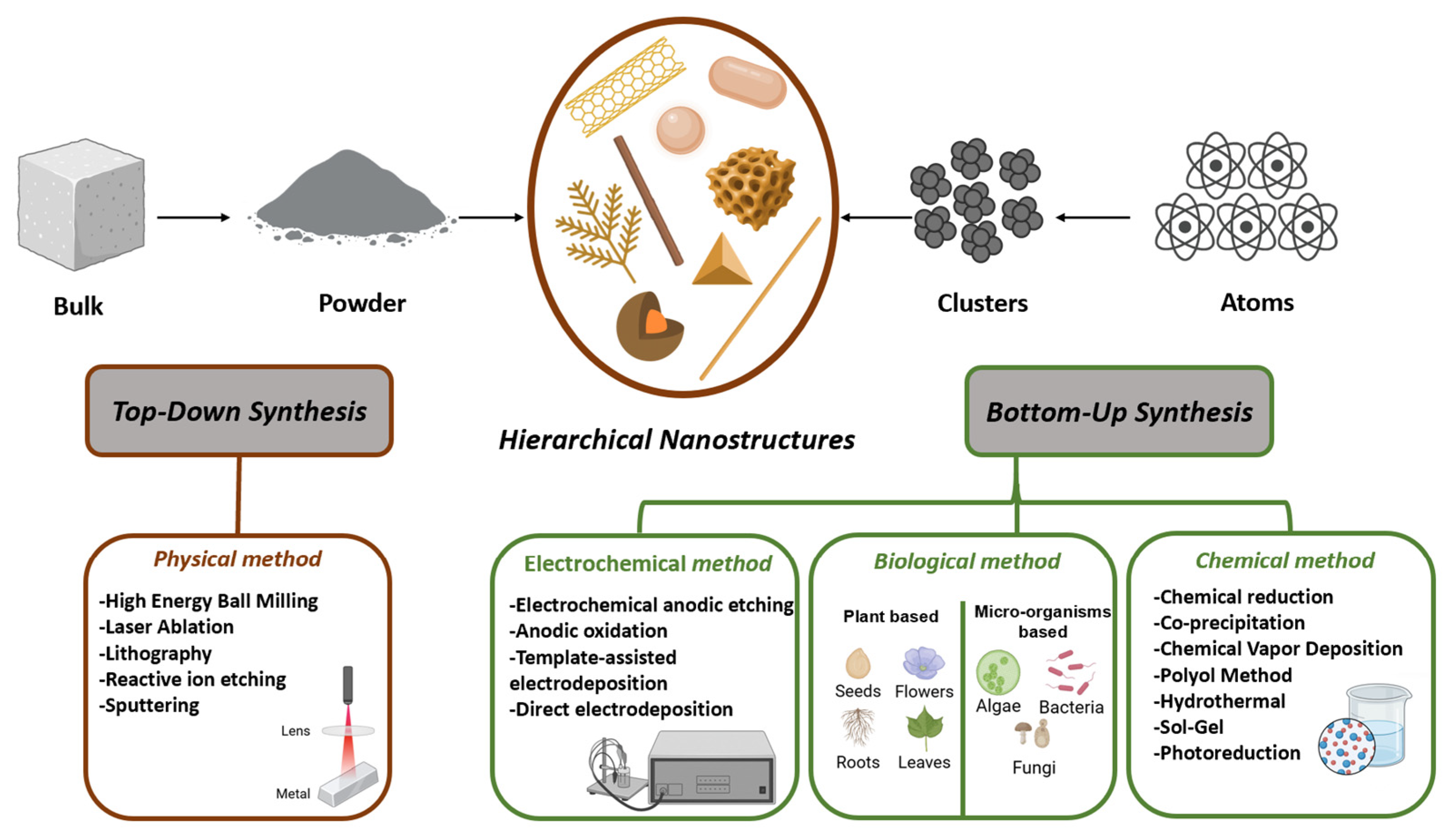 The synthesis of hierarchical nanomaterials is achieved through two distinct approaches: the “bottom-up” and the “top-down” methods (Figure 2). The bottom-up approach involves the preparation of nanomaterials atom by atom, molecule by molecule, or aggregate by aggregate. The assembly and arrangement of atoms, molecules, or aggregates are conducted in a precise and controlled manner, enabling the development of functional and structured materials. In contrast, the “top-down” approach involves the division of a material from a macroscopic state until it attains nanometric dimensions [20]. The primary techniques employed in this approach include high-energy milling, as well as optical and electronic lithography. The synthesis of hierarchical nanostructures can be categorized into three distinct approaches: direct growth on a substrate or in solution, assembly of nano-units (e.g., nanoparticles, nano-rods, nanowires, nanotubes, and nano-webs), and templated synthesis using alumina matrices.