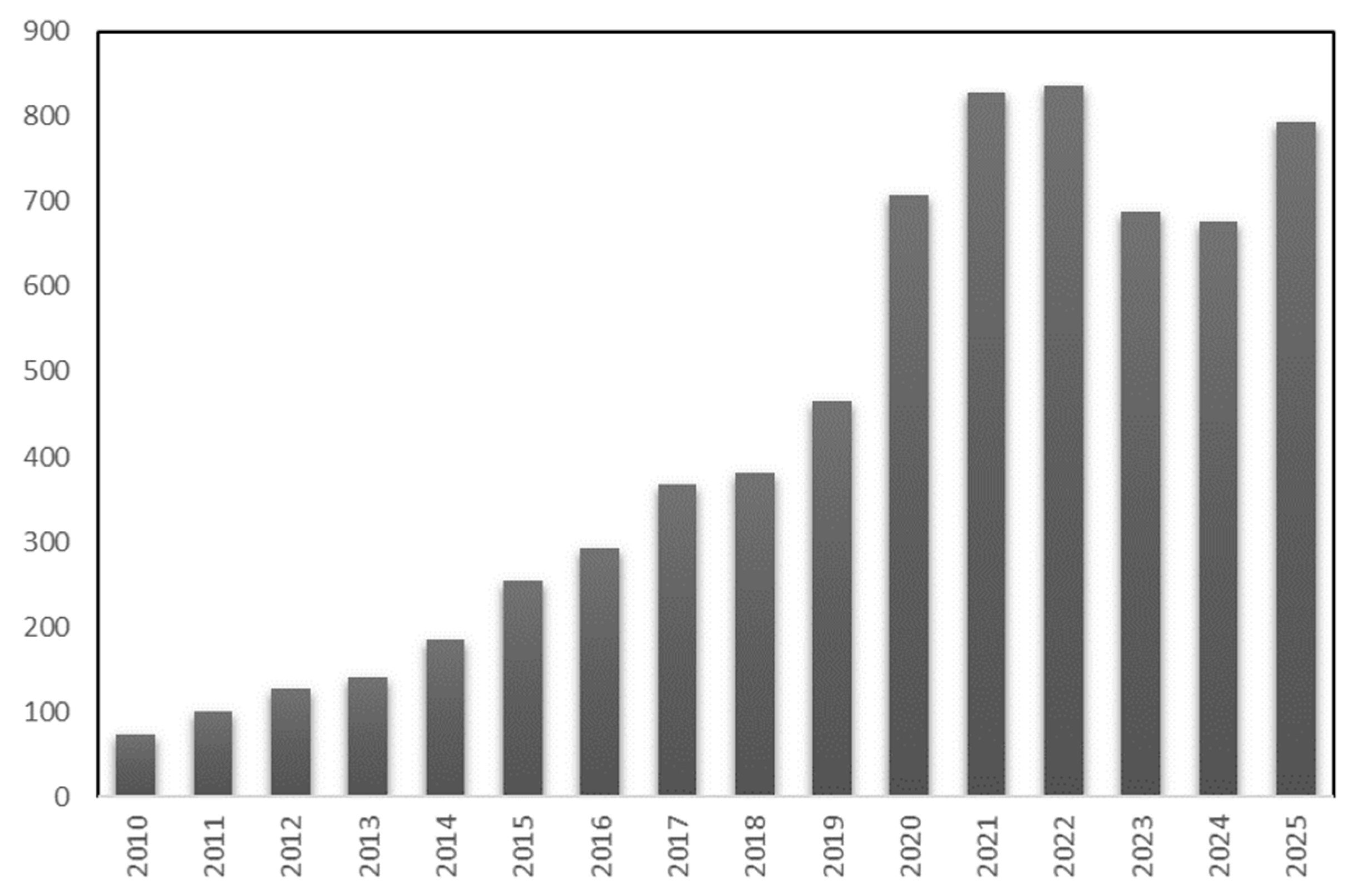 Figure 3. Number of Publications on Hierarchical Nanostructures for Electrochemical Detection (2010–2025).
