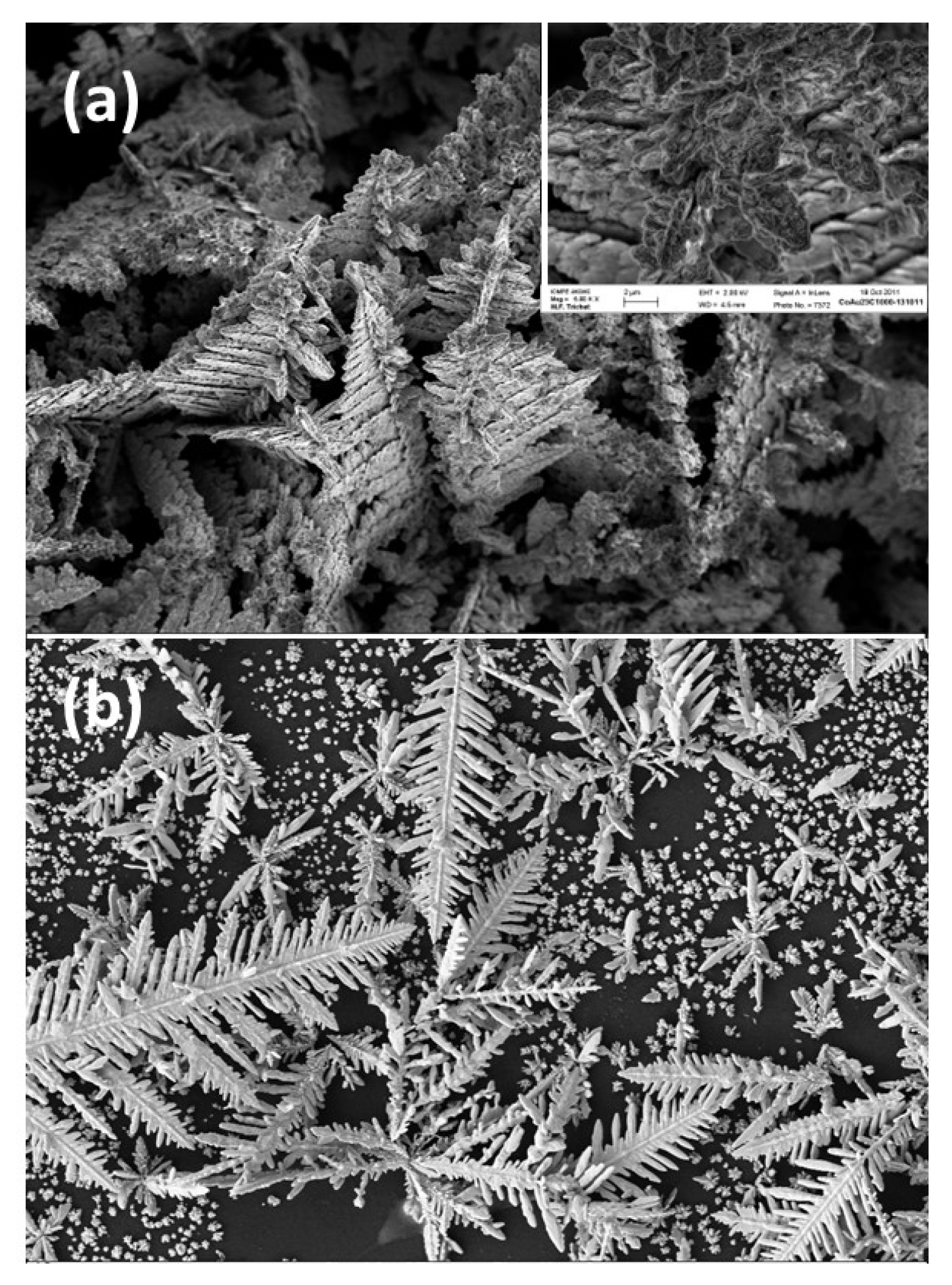 Figure 4. Direct growth of cobalt (a) and silver (b) dendrites with distinguished multiple levels of branches and sub-branches, using the electrochemical deposition method [34,35]. The insert of (a) corresponds to its high magnification. Reproduced with permission from refs. [34,35].
