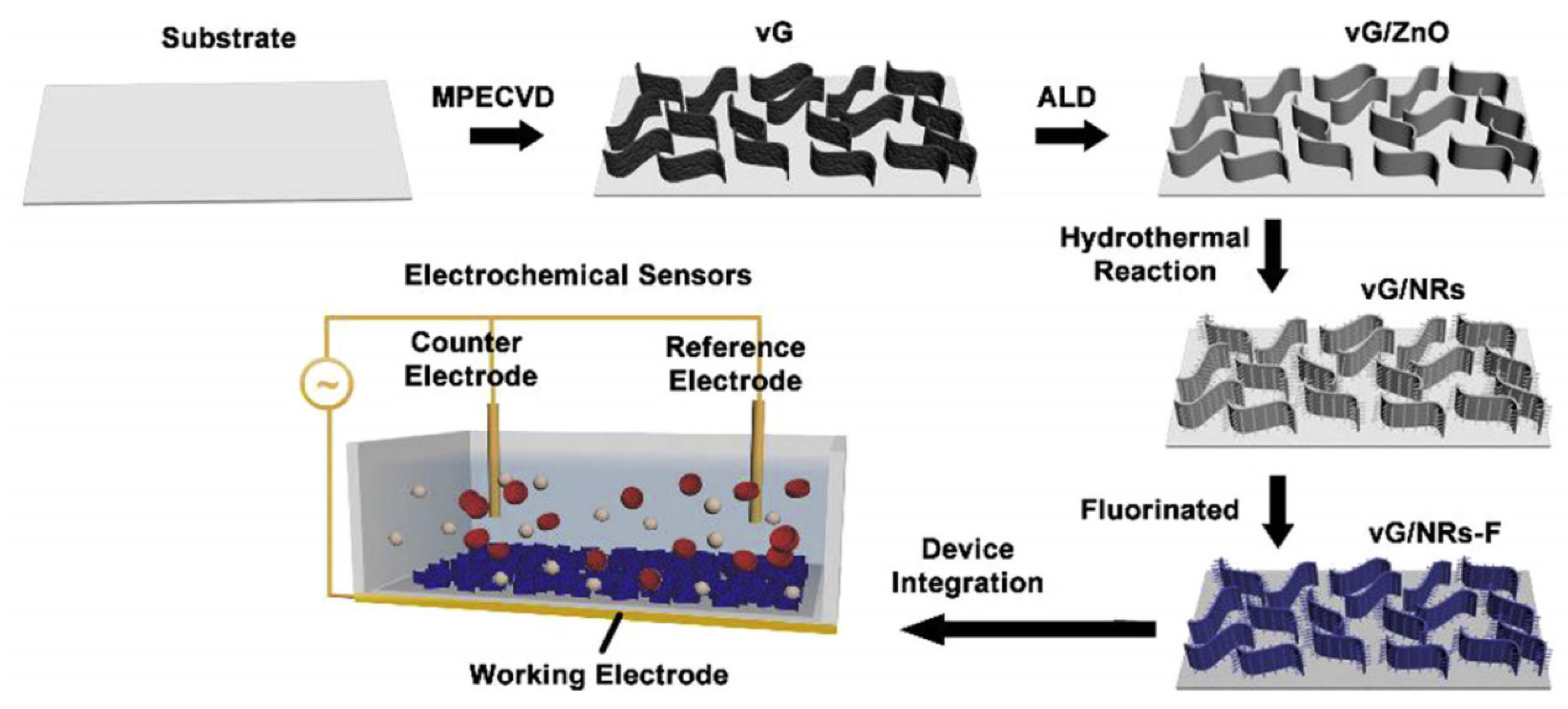 Figure 5. Fabrication process of hierarchical graphene/nanorods structure and the integration of electrochemical sensors based on it [43]. Reproduced with permission from ref. [43].