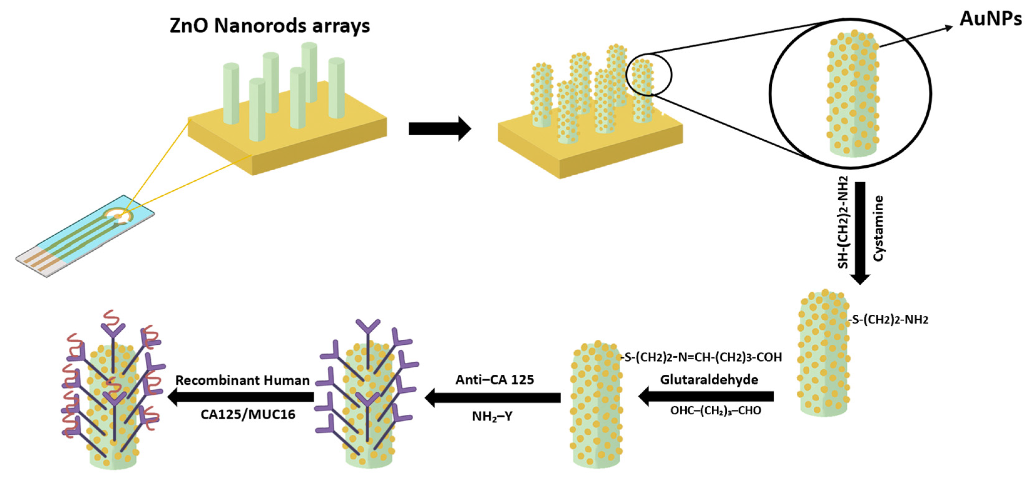 ZnO NRs-Au NPs hybrids: Gasparotto et al. [79] synthesized nanohybrids made of ZnO nanorods (ZnO NRs) and Au NPs by making them grow on the working electrode to develop a sensor to specifically detect the ovarian cancer antigen CA-125/MUC126, as shown in Figure 10. The incorporation of Au NPs provided a platform conducive to antigen binding, thereby enabling the sensor to demonstrate remarkable performance in the detection of the human ovarian cancer antigen. The sensor exhibited a detection limit of 2.5 ng/μL, which was 100-fold lower than that of the most prevalent immunoblot system.
