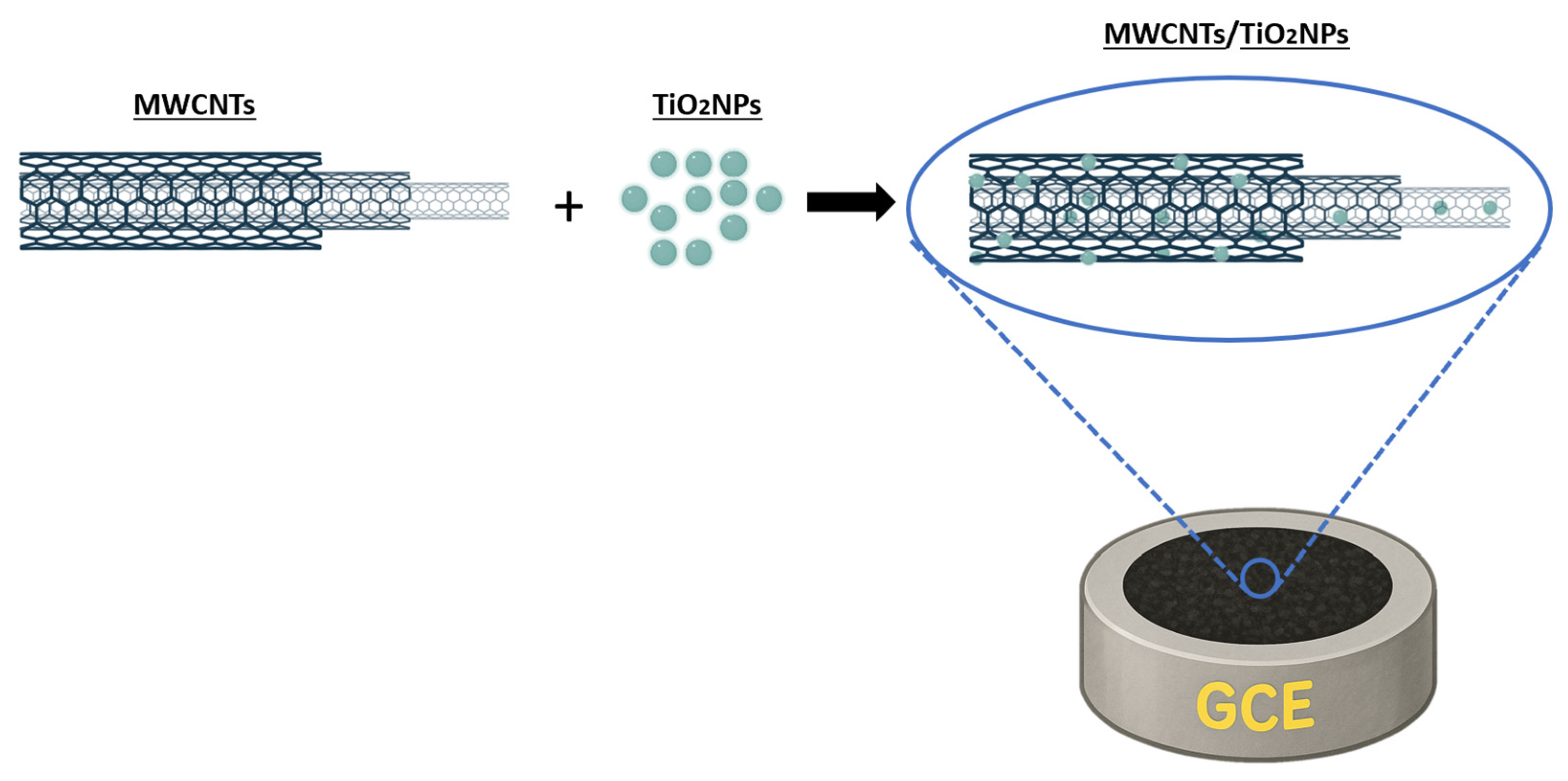 Madrakian et al. used nanocomposites of Fe3O4/MWCNT to modify GCEs. The proposed sensors have been effectively used to detect rizatriptan (RZB) in blood samples and real-world drugs [91]. In a separate study, Ghaedi et al. demonstrated that the ZnO-MWCNT/carbon paste electrode (CPE) exhibited outstanding analytical performance for the measurement of citalopram, with extremely low detection limits, high sensitivity, and excellent reproducibility and repeatability when compared to other techniques published in the literature [92]. Fotouhi et al. developed an efficient electrochemical sensor based on MWCNTs and TiO2 NPs in a chitosan matrix, as demonstrated in Figure 11. The simultaneous determination of hydroquinone (HQ), catechol (CC), and resorcinol (RS) was achieved with adequate analytical performance in separate or three-component solutions [93]. As demonstrated by Arévalo et al., the utilization of electrochemical sensors based on a GCE modified with MWCNTs/CuO NPs resulted in the quantitative detection of glycerol in biodiesel samples exhibiting good performance, stability, reproducibility, repeatability, low detection limits, and wide linear concentration ranges [94]. Tavana et al. synthesized Pt-Pd/NiO-NPs decorating the surface of single-walled carbon nanotubes (SWCNTs) using a simple chemical precipitation process [95]. The utilization of CPEs based on the nanocomposite material led to the detection of nalbuphine with a detection limit of 0.9 nM and tramadol with a detection limit of 50.0 nM in drug samples. In a related development, Yue et al. proposed electrochemical sensors based on NiO NPs and MWCNTs to detect nitrite [96]. The most advanced device exhibited a sensitive response to the analyte with a linear relationship between the peak oxidation current and concentration ranging from 10−6 M to 10−4 M (R = 0.997), a sensitivity of 3.53 µA µM−1, and a detection limit of 0.25 µM (S/N = 3).