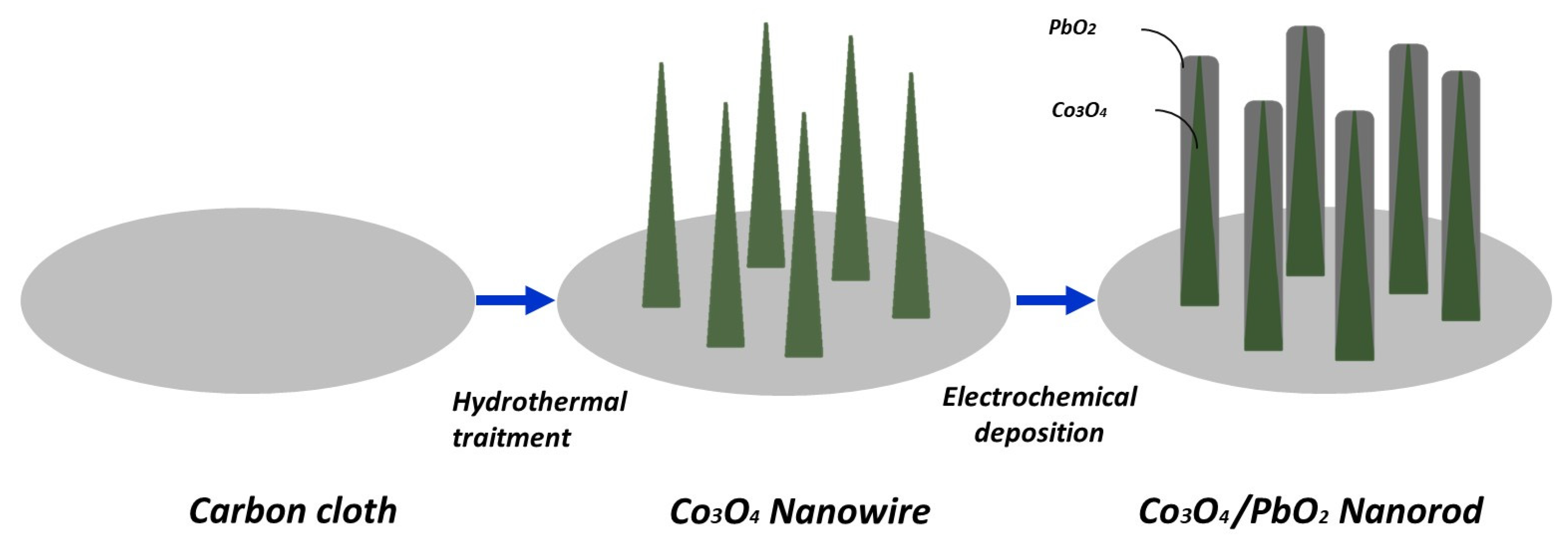 Figure 14. Schematic representation of the synthesis of the Co3O4 nanowire, and the Co3O4/PbO2 nanorod [120].