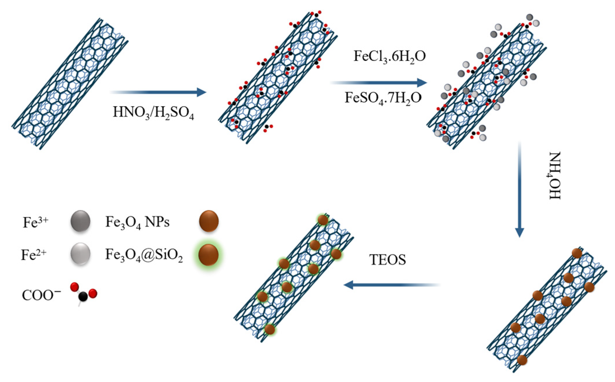 Figure 15. Schematic representation of the preparation process of Fe3O4@SiO2/MWCNT nanocomposite [123].