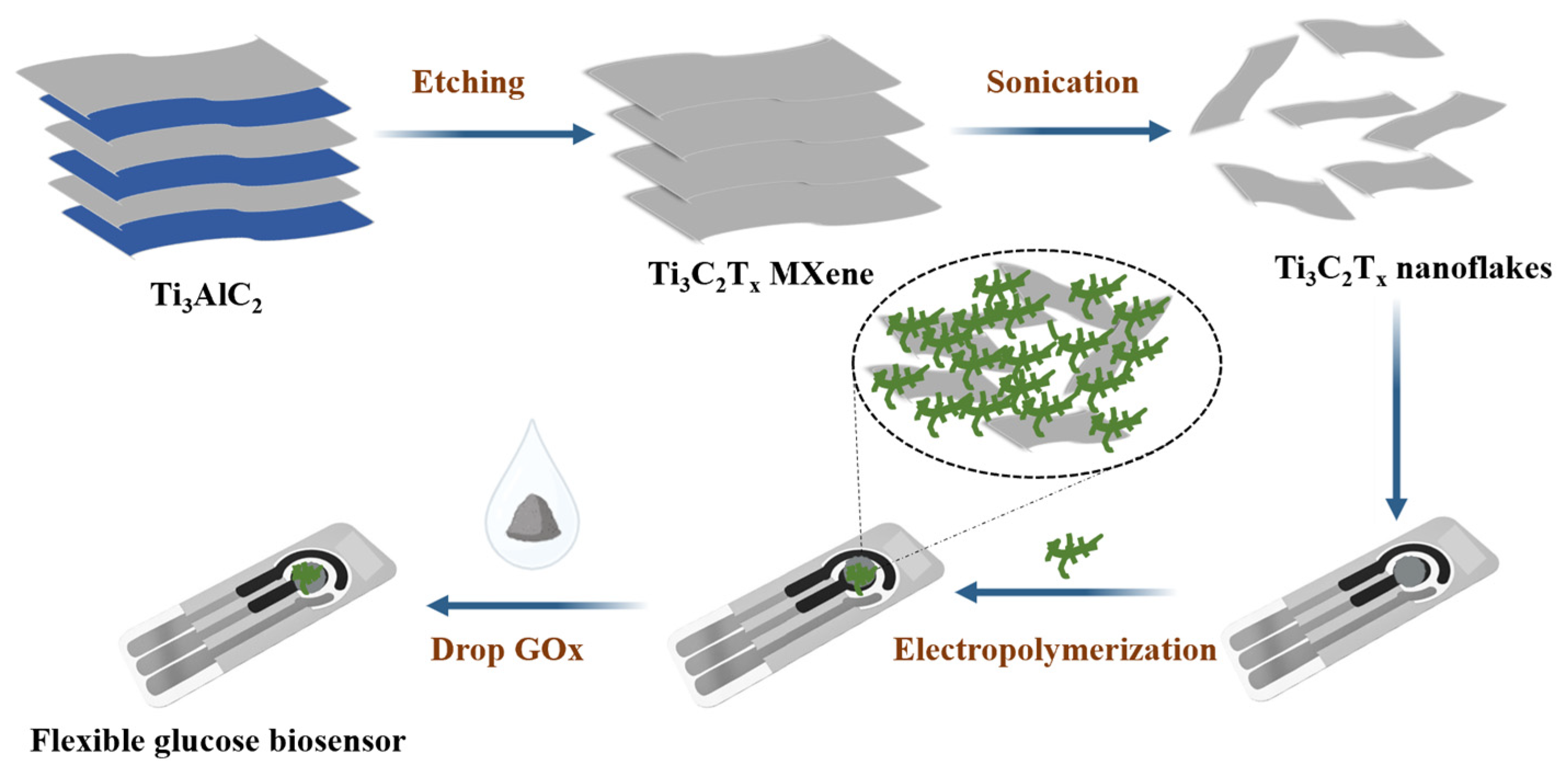 Figure 16. Schematic illustration of the preparation of Ti3C2Tx, Ti3C2Tx/PANI, and the flexible Ti3C2Tx/PANI/GOx flexible glucose biosensor [127].