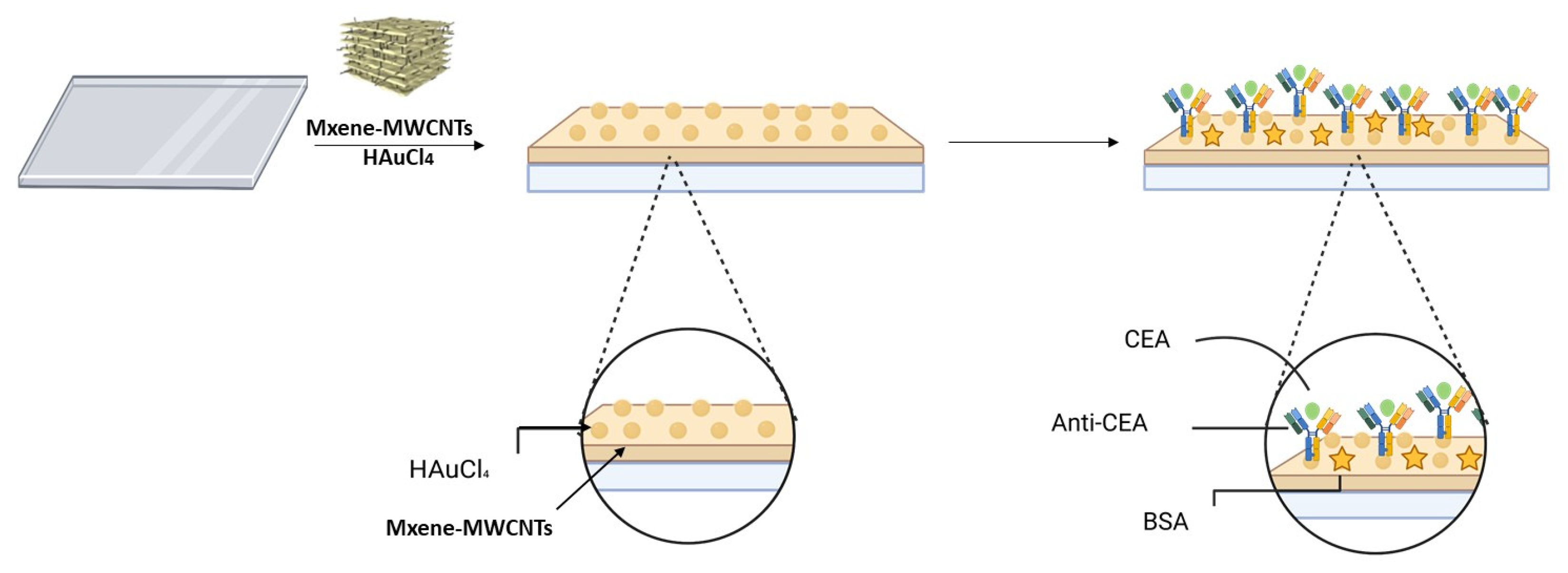 Figure 17. Fabrication Strategy of the MXene–MWCNT Nanocomposite Electrochemical Immunosensor for CEA Detection [129].