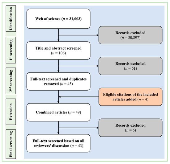 The study selection process is summarized in Figure 1. The initial database search yielded 31,003 records. Following the initial screening of titles and abstracts, 106 records were retained for full-text review. After a full-text assessment by a second independent reviewer, which led to the exclusion of non-qualifying and duplicate records, 45 articles remained. Additionally, a manual search of the reference lists from these 45 articles identified 4 further eligible publications, resulting in a total of 49 articles. A final collective review by all authors led to the exclusion of 6 additional articles. Consequently, a final total of 43 studies were included.
