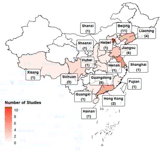 As summarized in Figure 2 and Table S3 (Supplementary Materials), the 43 studies include 17 on air pollution, 14 on noise, 7 on light, and 5 on water pollution. No eligible studies on soil pollution or microbes were found. Among the 17 studies on air pollution, twelve examined particulate matter (PM), and five examined total volatile organic compounds (TVOCs). No eligible studies were found for ozone, ammonia, radon, sulfur oxides, or a specific VOC. Regarding light, six studies measured UVR and one investigated visible light (VIS). No studies addressed electromagnetic or infrared radiation. In terms of environmental media, most studies (36 out of 43) focused on the atmospheric environment, with only seven addressing the aquatic environment. Thirty-three studies were published in the past ten years, while 22 were published in the past five years, indicating growing research interest in this field. Geographically, the studies were primarily conducted in Beijing (eleven papers) and Jiangsu (six papers), with the others in Liaoning, Shanghai, Guangdong, etc. The geographic distribution is visualized in Figure 3. As shown in the map, research efforts are heavily skewed towards economically developed regions in Eastern China (e.g., Beijing–Tianjin–Hebei, Yangtze River Delta and Guangdong province), while vast areas in Western and Central China remain largely under-investigated.