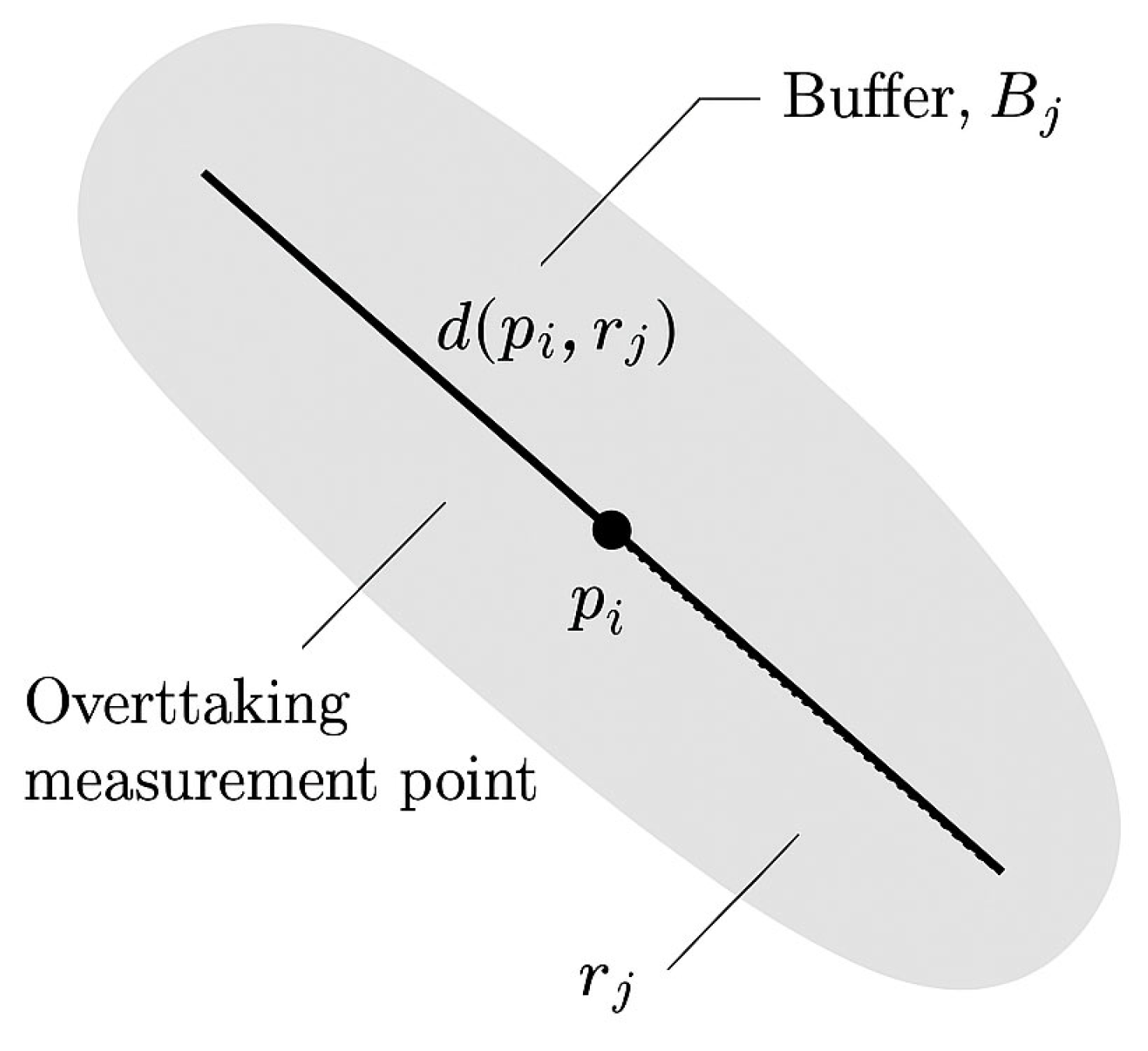 Let be the set of overtaking measurement points from the OBS dataset, where each represents a georeferenced location of an overtaking event. Let be the set of line segments from the GIP road network, each represented as a polyline geometry in . To account for potential GPS inaccuracy and to ensure correct matching, each road segment is buffered by a fixed radius , yielding a polygonal region: