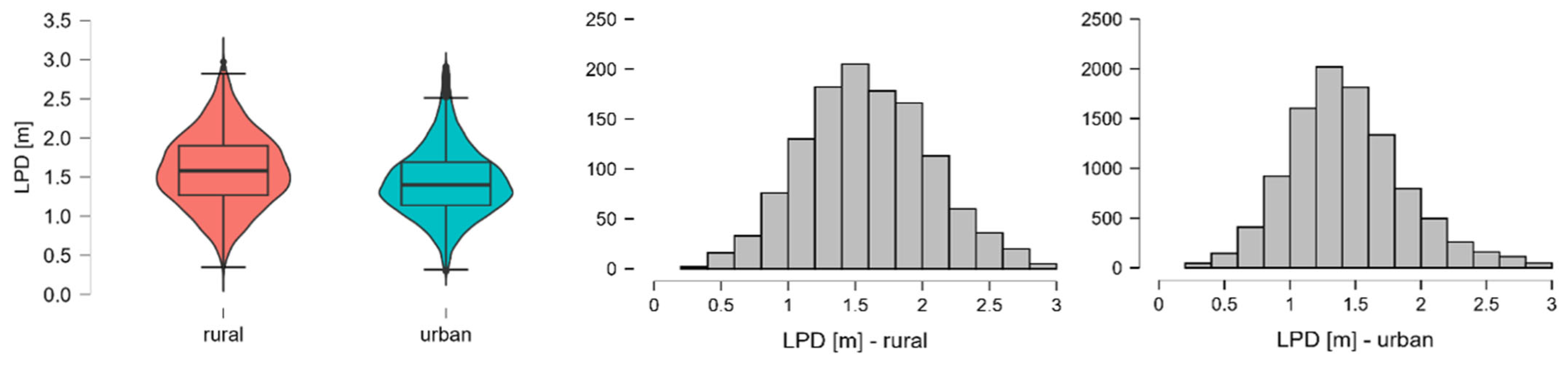 To complement the tabular overview, Figure 5 visualises the distribution of LPD across categories using violin plots for urban and rural settings.