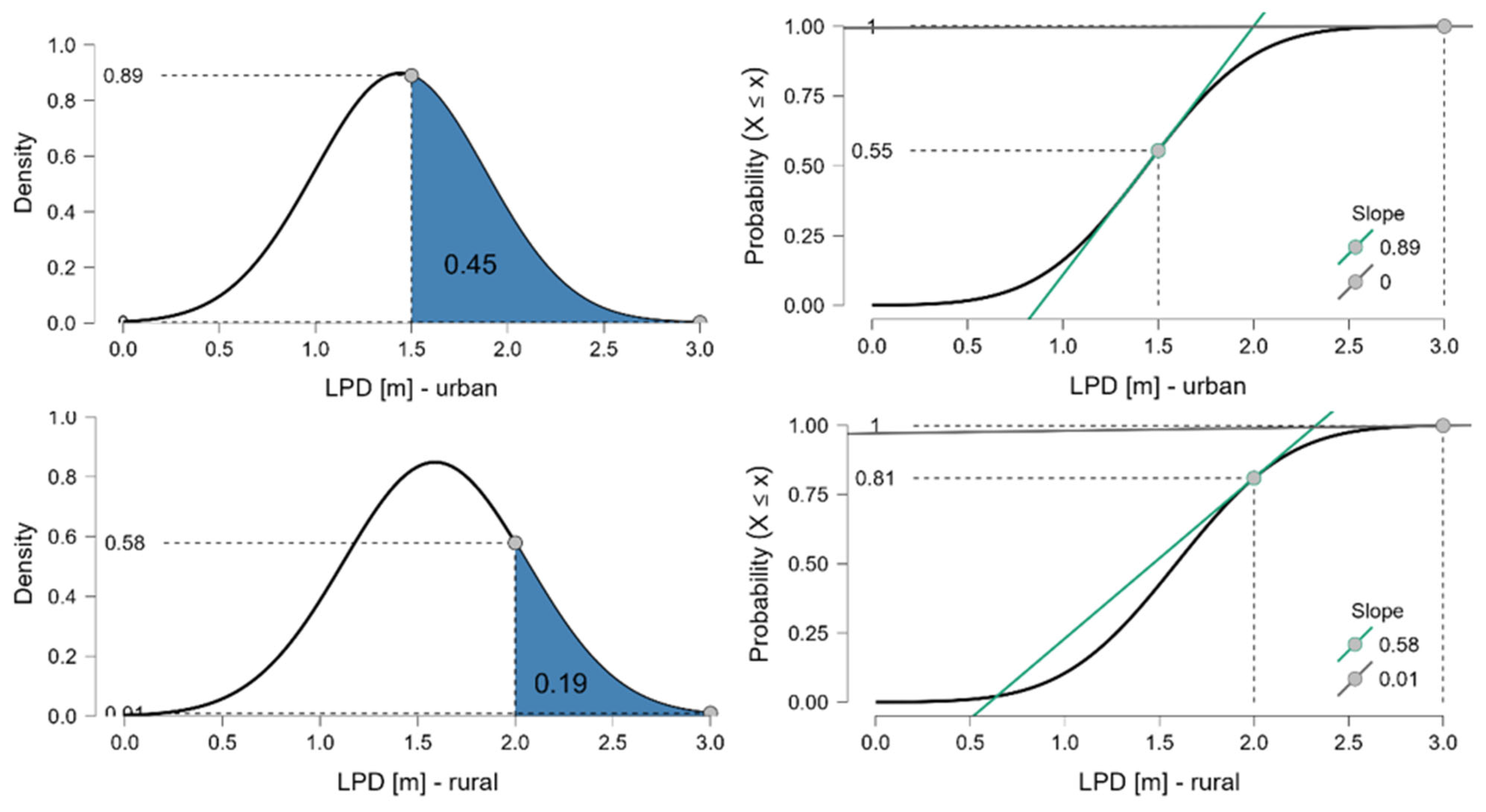 Modelled density (left) and cumulative probability (right) functions of lateral passing distance (LPD), based on fitted normal distributions using empirical means and standard deviations for urban (top row) and rural (bottom row) road segments. Vertical dashed lines indicate the legal minimum passing distance thresholds (1.5 m in urban areas, 2.0 m in rural areas). Shaded areas represent the modelled proportion of overtaking events exceeding these thresholds. Annotated values indicate cumulative probabilities at the respective thresholds. Green lines illustrate the local slope of the cumulative distribution at the threshold values. Observed compliance rates (urban: 40%; rural: 19%) are compared with modelled expectations (urban: 45%; rural: 19%).
