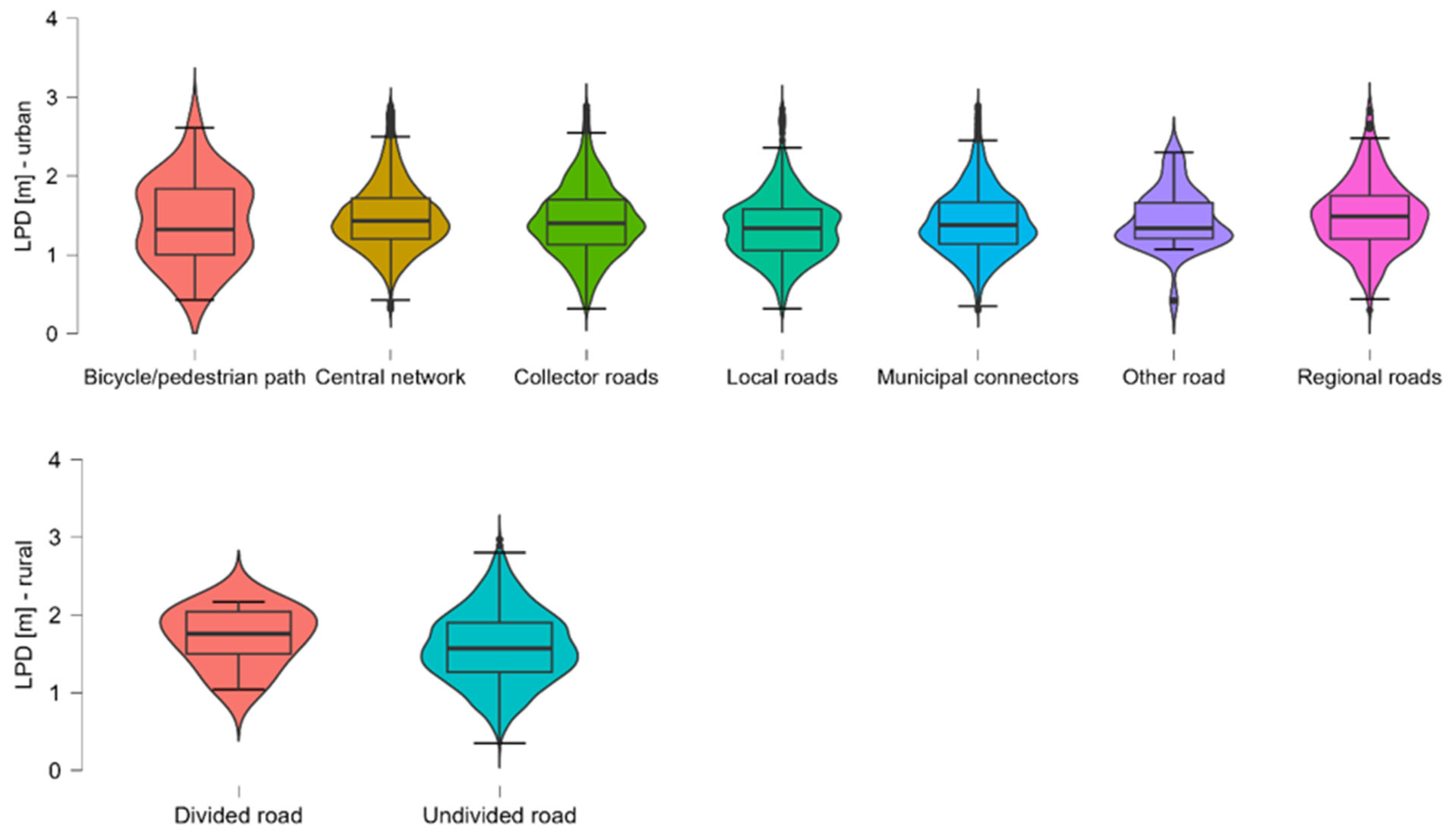 Across all categories, rural segments consistently exhibit higher mean and median overtaking distances compared to their urban counterparts. This is most evident for Central network roads (rural: M = 1.734 m vs. urban: M = 1.515 m) and regional roads (rural: M = 1.700 m vs. urban: M = 1.601 m), suggesting that increased spatial availability in rural areas contributes to safer overtaking behaviour. Within urban areas, Local roads (M = 1.353 m) and Collector roads (M = 1.431 m) showed the lowest average distances, indicating a higher potential for unsafe overtaking, likely due to spatial constraints and mixed traffic conditions. In contrast, Central network and regional roads offered the greatest lateral clearance, aligning with their higher functional classification and typically wider cross-sections. In rural areas, Central network and regional roads again yielded the highest LPD values, while Municipal connectors were slightly lower (M = 1.407 m), possibly reflecting more constrained geometries or less driver awareness of passing distance regulations on lower-class roads. The variability in LPD, as indicated by standard deviation and interquartile range, is relatively stable across categories, except for the Bicycle/pedestrian path group, which shows a higher IQR (0.840). This suggests highly inconsistent overtaking behaviour in this low-sample category, warranting cautious interpretation. Several urban categories exhibit minimum passing distances below 0.5 m, which underscores persistent safety risks in dense or poorly adapted traffic environments. Figure 4 visualises the distribution of LPD across Functional Road Class for both urban and rural road segments. The violin plots summarise the density, central tendency, and variability of overtaking distances within each class. Urban categories display wider spread and higher skewness in some segments (e.g., bicycle/pedestrian paths), indicating more heterogeneous overtaking behaviour. Rural categories, in contrast, exhibit more centred and symmetrical distributions with generally higher medians, reflecting greater spatial availability.