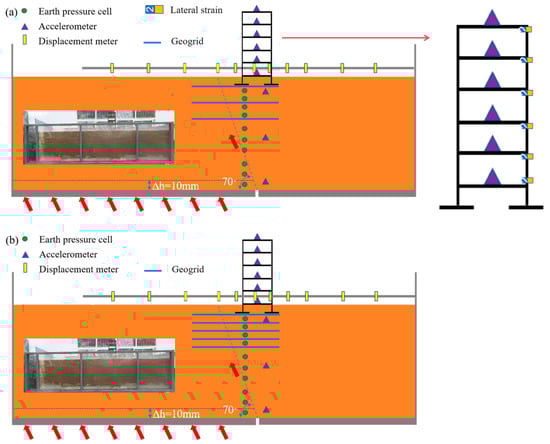 The detailed test scheme is shown in Table 3. Prior to installation, all sensors, including earth pressure cells, accelerometers, and displacement meters, underwent rigorous static and dynamic calibration to ensure measurement accuracy and data reliability throughout the test duration. As shown in Figure 6 and Figure 7, for real-time monitoring of the dynamic response and earth pressure changes within the overburden soil, accelerometers and earth pressure cells were installed at key locations where the fault traverses the soil mass, to capture in real time the propagation patterns of dynamic response and the pressure evolution process at different depths [44]. A set of strain gauges were arranged along the length of the geogrid to accurately analyze the strain distribution patterns and stress transfer mechanism of the geogrid structure under load. Additionally, accelerometers and strain gauges were installed on each story of the building to detect its dynamic and stress responses during the test. Finally, by utilizing the multi-source data collected by the acquisition system, a comprehensive dynamic response analysis of the interaction among the overburden, reinforced foundation, and building was conducted [45,46,47,48]. Relevant sensor parameters are presented in Table 4.