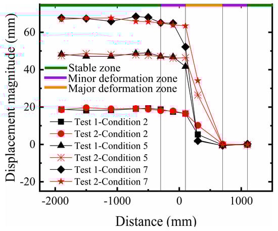 Based on the aforementioned description of macroscopic failure phenomena, and similarly analyzing the surface deformation of the site across three failure stages, the final surface deformation characteristics can be divided into the stable zone, the minor deformation zone, and the major deformation zone. During the initial stage of fault development, the scarp was relatively gentle, and basal deformation was not significant. As the scarp gradually developed towards the final rupture stage, the extent of the steep slope expanded, and the soil near the fault in the hanging wall exhibited differential uplift. In the stable zone farther from the fault, the soil essentially underwent rigid body movement. The minor deformation zone serves as a transition area between the stable zone and the major deformation zone. With increasing dislocation, the extent of the minor deformation zone in Test 1 expanded, and the displacement amplitude increased significantly. In contrast, although Test 2 also showed an increase, the magnitude of growth was smaller, demonstrating a superior strain accommodation capacity (As shown in Figure 9). In the final rupture stage, the minor deformation zone in Test 1 expanded further with intensified displacement response, whereas in Test 2, the extent of its minor deformation zone did not increase significantly. This indicates that the multi-layer geogrid system effectively altered the transmission path of the fault displacement and the form of the surface scarp.