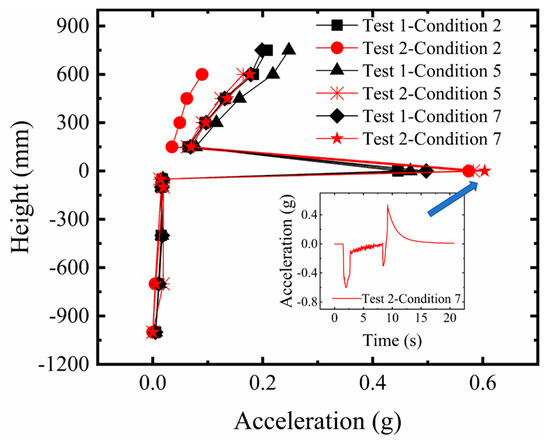 Figure 10 displays the microseismic acceleration response of the sandy soil overburden and the structure under fault pulse action. Analysis indicates that the microseismic acceleration values within the overburden remained consistently close to zero throughout the process from the initial stage to the final rupture in both Test 1 and Test 2. This suggests that the number of geogrid layers had minimal impact on the dynamic response of the overburden in this region, with their constraining effect primarily manifested in the deformation concentration zone near the fault. The microseismic acceleration showed a slight increase with decreasing thickness, but overall remained near zero. At the overburden surface, the microseismic acceleration increased with greater bedrock dislocation and intensified soil rupture, resulting in a peak pulse energy release exceeding 0.4 g. For the structure, the microseismic acceleration in the upper stories increased with building height. Under the same rupture mode, the overall acceleration response of the structure in Test 2 was smaller than in Test 1. This is attributed to the more significant soil improvement from the five-layer geogrids, which resulted in the surface rupture point being farther away, thus the structure experienced a smaller pulse response.