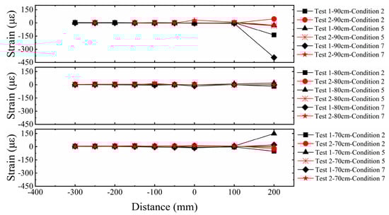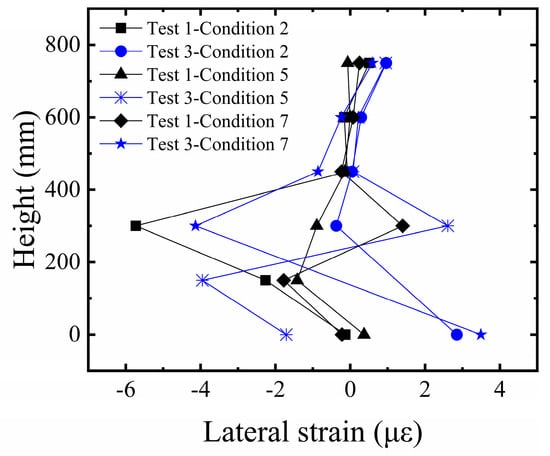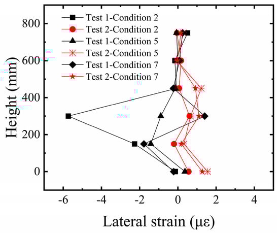 In this study, our primary method for characterizing structural fracture resistance is by evaluating the foundation system’s ability to maintain overall stability (tilt) and control structural deformation (edge column strain) when subjected to significant surface fault rupture. The strain response of the building’s edge columns is a key indicator for revealing the structural stress state under fault displacement. As shown in Figure 11, the analysis of vertical strain in the edge columns of the building model indicates a significant regularity in the strain distribution along the height of the structure. The edge columns at the ground story exhibit the maximum strain value due to direct foundation restraint and the load transferred from the superstructure. The strain decreases progressively with increasing height, approaching zero at the top story. Furthermore, a comparison between Test 1 and Test 2 shows that the distribution trend of lateral strain along the height is generally consistent in both tests, with larger strain amplitudes in the middle and lower regions. This reflects a mechanically consistent behavior in the edge columns under different reinforcement conditions. However, the strain response in Test 1 was significantly higher than in Test 2, clearly indicating that the significant differential surface deformation, due to insufficient foundation restraint, induced severe bending deformation in the edge columns. Although the strain response of the edge columns in Test 2 increased synchronously with the bedrock dislocation, the strain amplitude was effectively controlled. This confirms that the five-layer geogrid system successfully improved the strain response of the structure under large deformation conditions.
