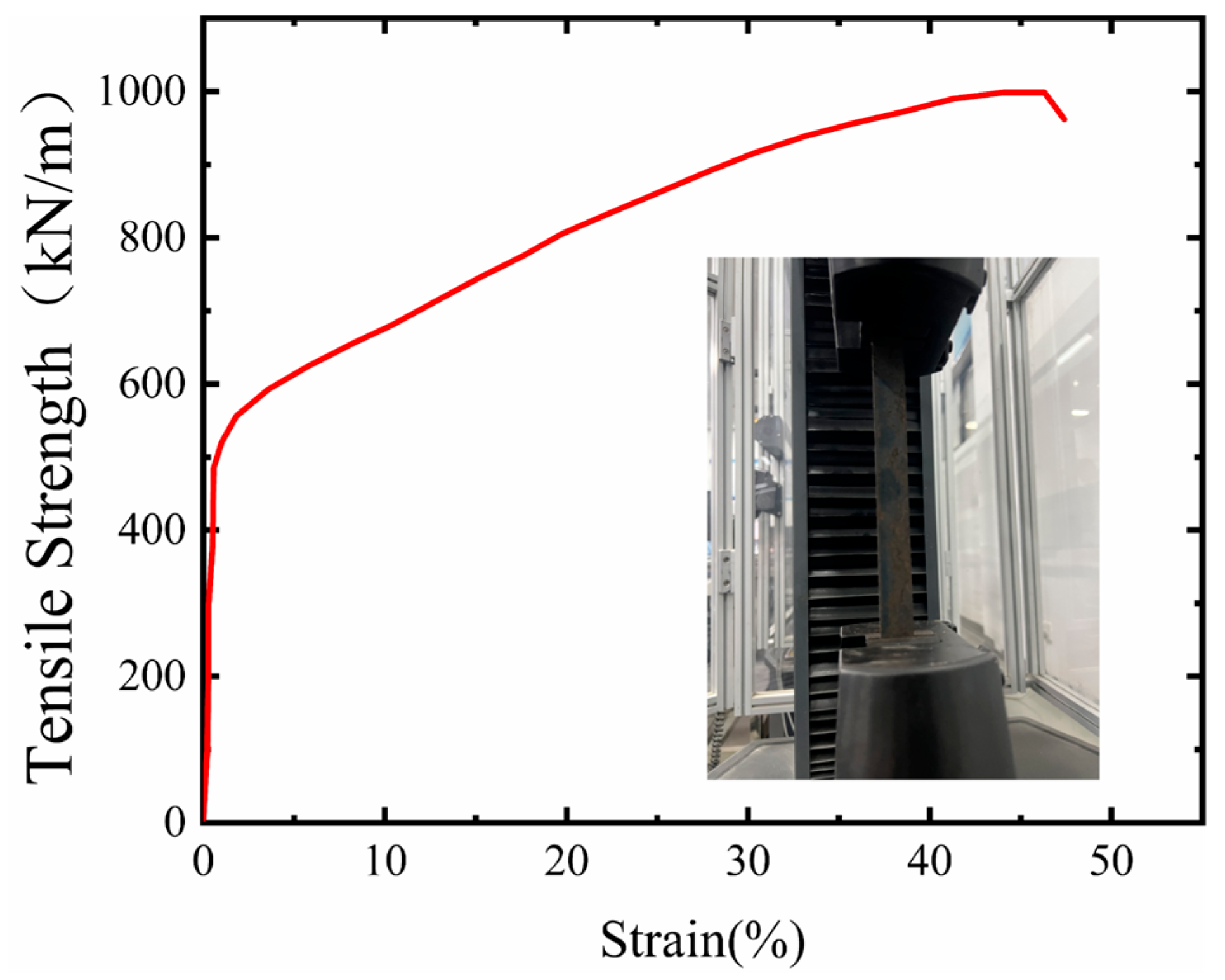 - Chen, L. Experimental Study on Tensile Properties of Plastic Geogrid. Master’s Thesis, Shijiazhuang Tiedao University, Shijiazhuang, China, 2020. (In Chinese). [Google Scholar] [CrossRef]