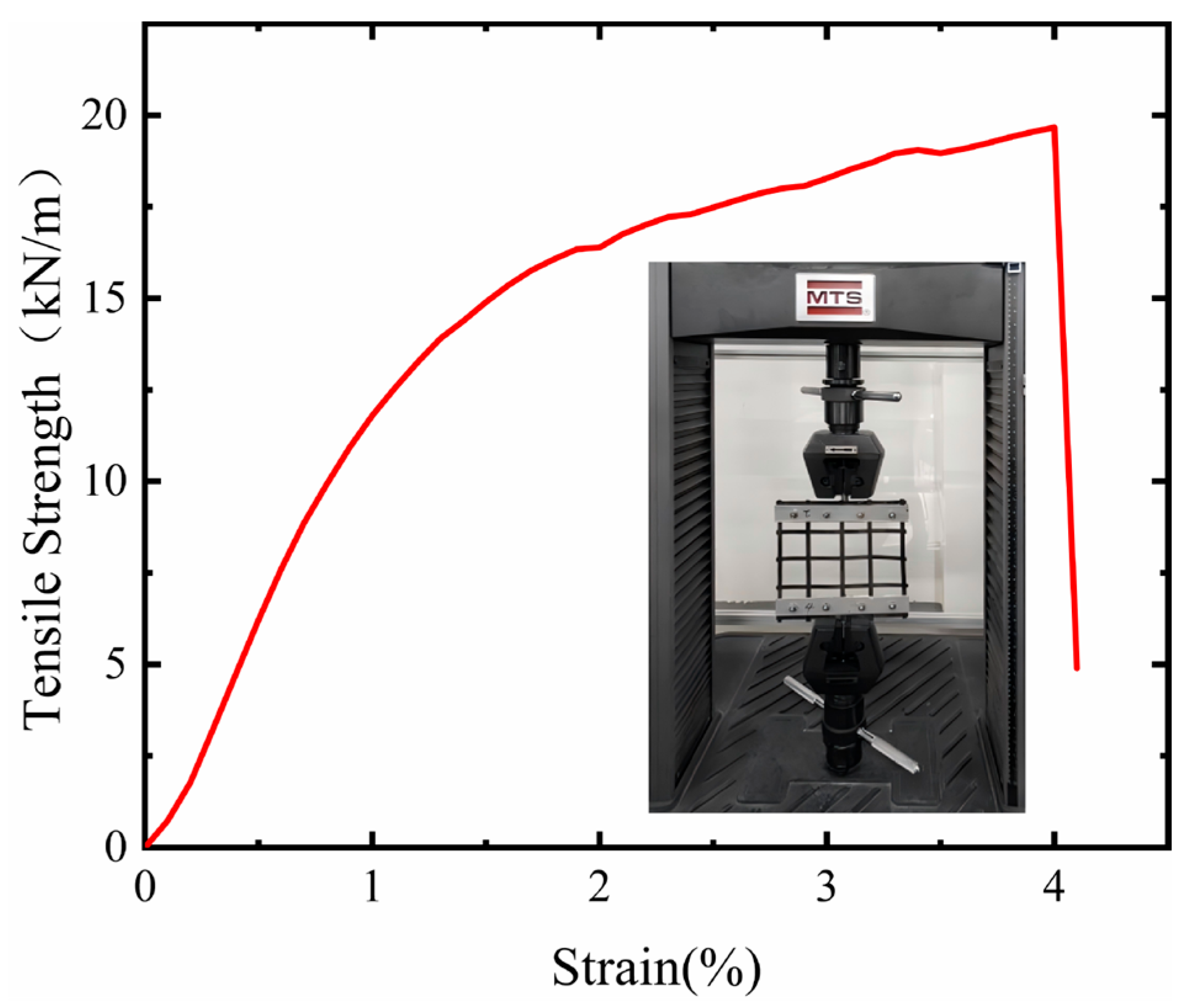 43], this test employed a biaxial steel-plastic geogrid, with both the longitudinal and transverse ribs of a single grid measuring 60 mm in length. The structure of the geogrid is illustrated in the accompanying figure. For the tensile test of the geogrid, this study utilized a microcomputer-controlled electronic universal testing machine and conducted a uniaxial tensile test using the multi-rib method. The test results are shown in