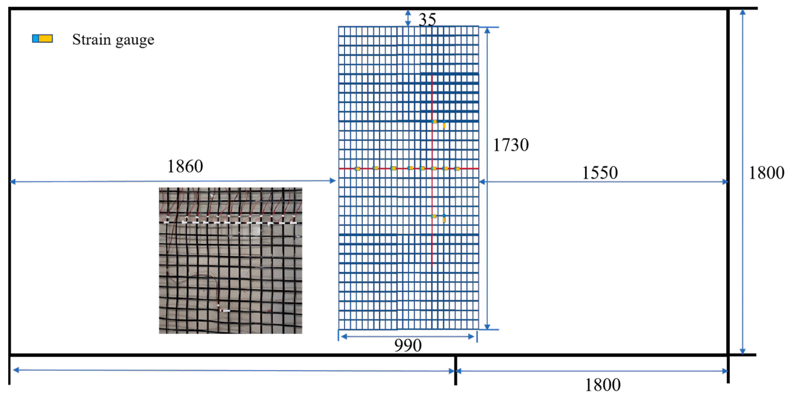 Top view of geogrid arrangement and strain gauge layout on the geogrid. (Unit: mm).