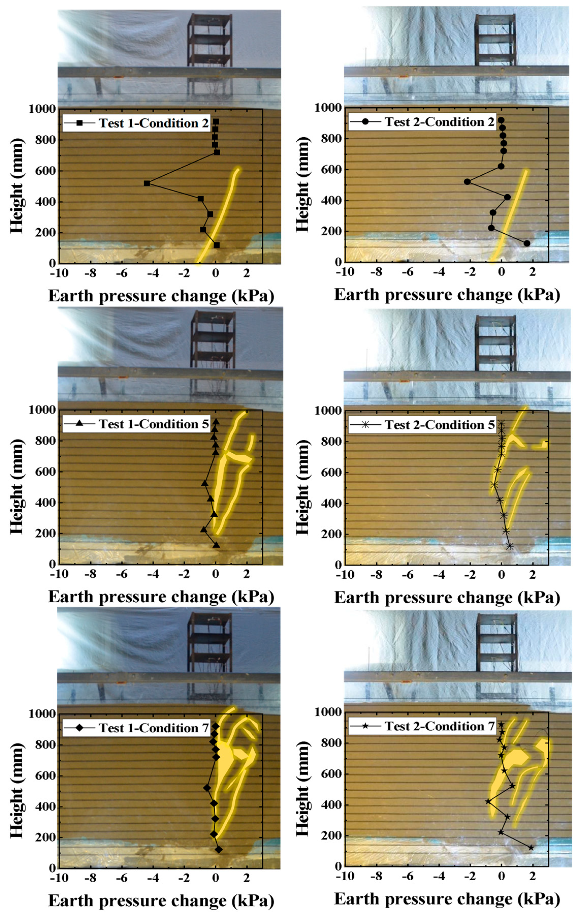 Figure 8, which presents a series of front views and the corresponding internal earth pressure changes for Test 1 and Test 2 at bedrock dislocation amounts of 2 cm, 5 cm, and 7 cm, the red dashed line depicts the fault rupture path, while the black solid line represents the variation in earth pressure within the soil mass. The figure reveals a close relationship between earth pressure and the soil failure zone, where changes in earth pressure precede and predict the development of visible rupture, unveiling the mechanism of energy accumulation and release during fault displacement. Significant earth pressure changes occur even during minor soil cracking, whereas when a larger failure zone develops, the earth pressure exhibits only minor variations due to prior stress release.