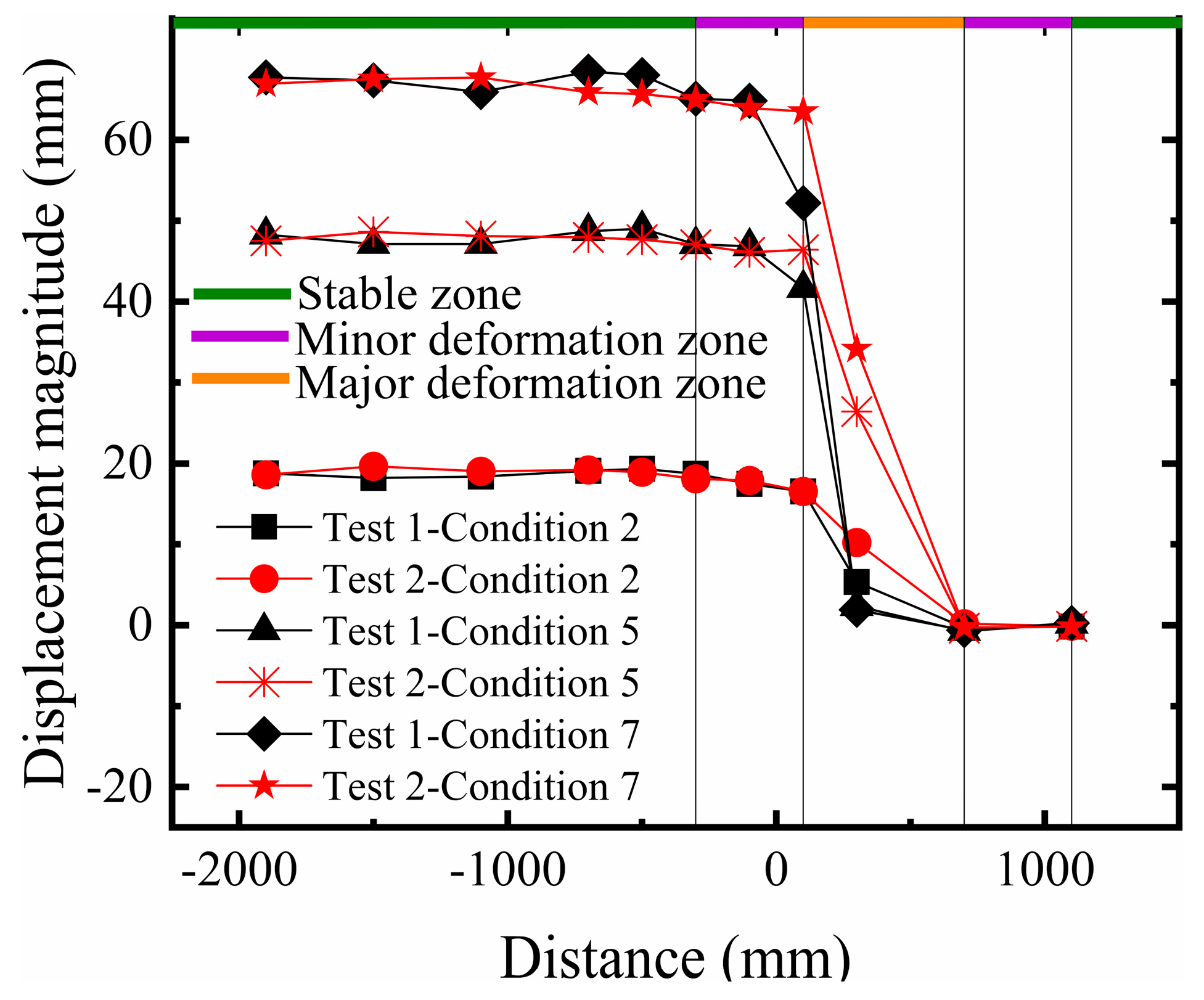 As the bedrock dislocation increased to 5 cm (minor basal dislocation stage), the internal micro-fractures connected to form a macroscopic rupture trace that propagated through to the surface. It is noteworthy that the magnitude of earth pressure change decreased during this stage. This is because the major stress had already been released through soil yielding in the initial stage, and the current displacement was primarily converted into visible rupture and surface deformation. Comparing Test 1 and Test 2, the rupture zone in Test 2 was narrower and located farther from the structure, directly attributable to the more uniform and stronger lateral confinement provided by the additional geogrid layers.