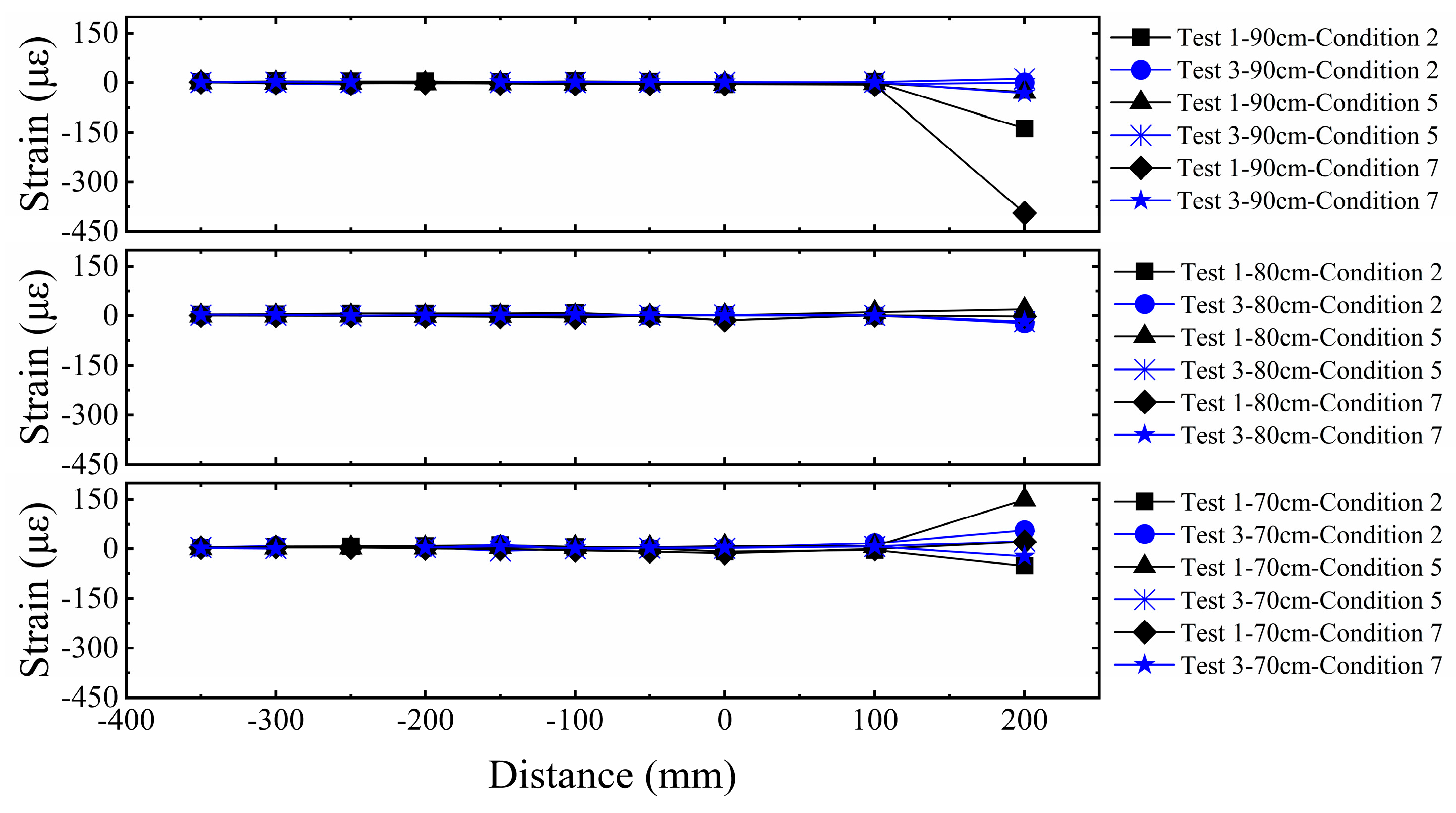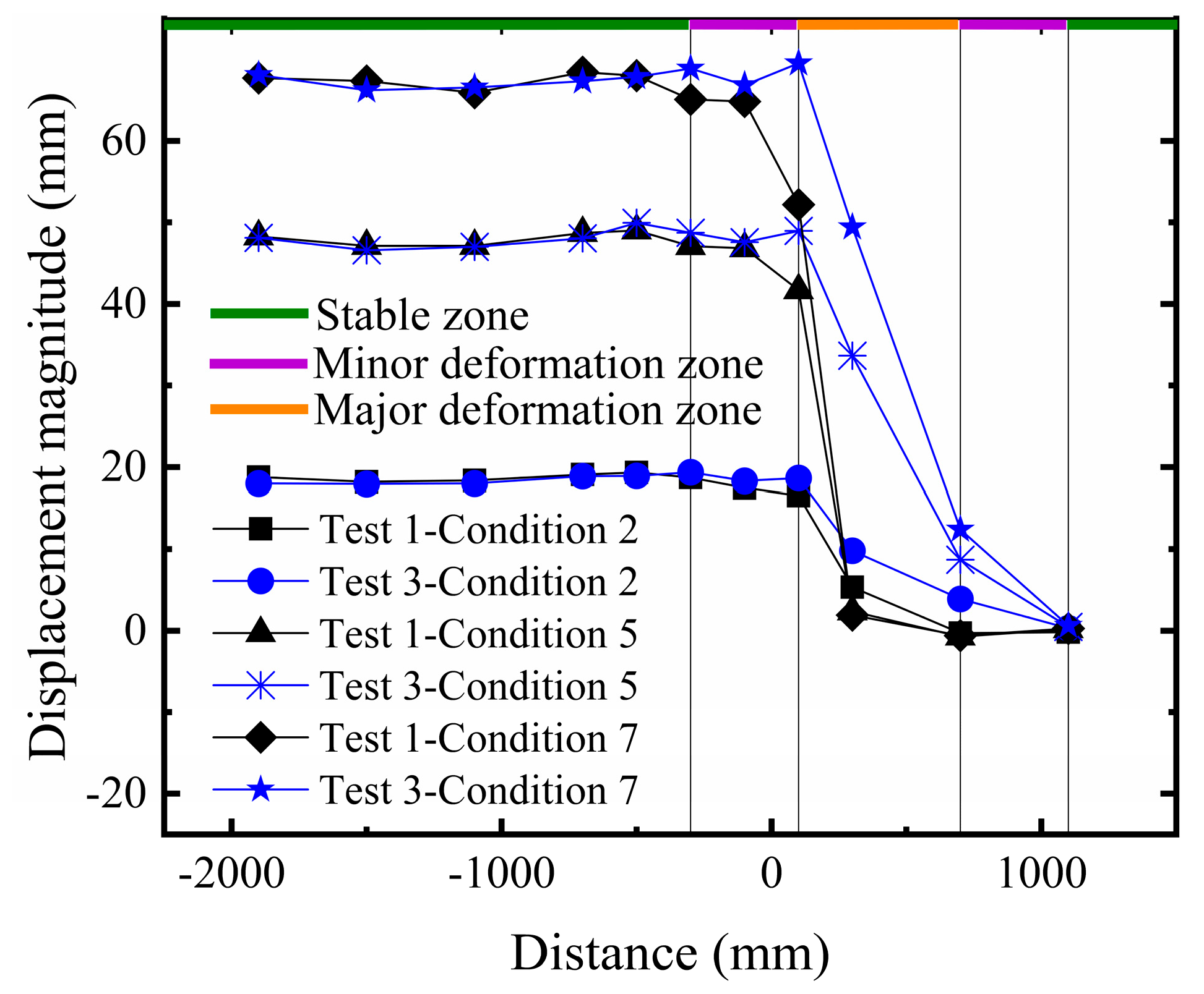 The experimental data for the test on the horizontally reinforced composite foundation across a high-angle normal fault primarily encompassed earth pressure, acceleration of the overburden and the structure, structural strain, and geogrid strain. During each test, data were collected at every 10 mm of dislocation, with each interval recorded as a working condition, resulting in a total of 10 working conditions. The test process could be divided into three stages based on fault propagation (initial stage, minor basal dislocation stage, and final rupture stage), One representative working condition from each stage was selected for comprehensive comparative analysis.