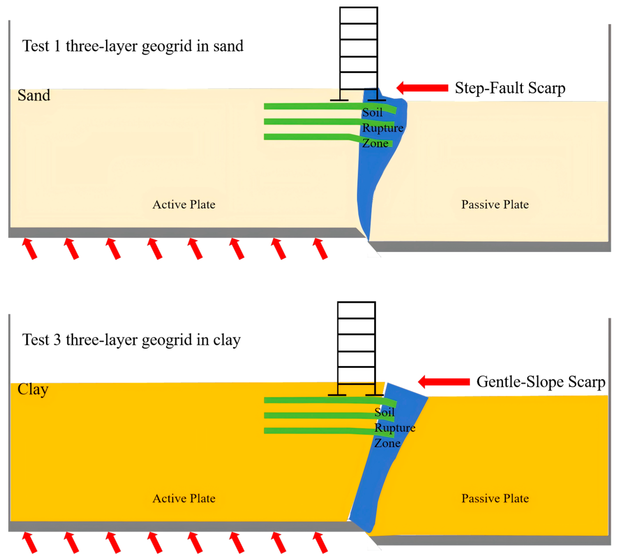 Figure 2). The tests compared the anti-fracture effectiveness of the geogrids under varying numbers of reinforcement layers, different layer spacings, and in different soil types (sand/clay). Dynamic and deformation responses were monitored via sensors installed within the soil mass, on the geogrids, and on the structure. The aim was to elucidate the corresponded working mechanism and the resulting mitigation effectiveness of the reinforced soil foundation-structure system under fault movement.