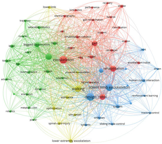 To deeply analyze the research hotspots and development context in the field of lower limb exoskeleton robots, a visual analysis of the literature was conducted on the Web of Science database using “lower limb exoskeleton” as the subject term, and a keyword co-occurrence visualization network was constructed, as shown in Figure 2. The results show that research in this field mainly focuses on four directions: first, rehabilitation and gait reconstruction (red cluster), which focuses on assisting patients with gait recovery through exoskeletons; second, biomechanics and motion analysis (green cluster), which emphasizes control methods based on dynamic modeling to improve the system and the natural movement of the human body in terms of coordination; third, control strategy and intelligent algorithm (blue cluster), which is the core direction of the current research, mainly exploring intelligent control methods such as human–machine collaboration, adaptive control, and deep reinforcement learning; fourth, system design and performance evaluation (yellow cluster), focusing on exoskeleton structure optimization, assistance effect, and energy consumption efficiency evaluation.