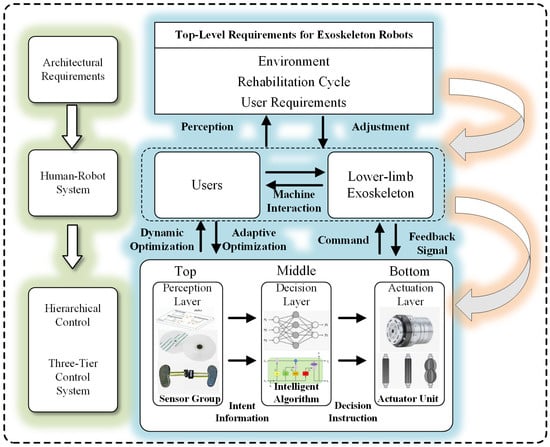 With the widespread application of lower limb exoskeleton robots in fields such as rehabilitation medicine and walking assistance, the design of their control systems has become crucial for achieving efficient human–robot collaboration. Lower limb exoskeletons are categorized into two main types: active control and passive control. Active control typically consists of three levels: perception, decision-making, and execution [35,36,37]. The overall control architecture of the lower limb exoskeleton robot is shown in Figure 4.