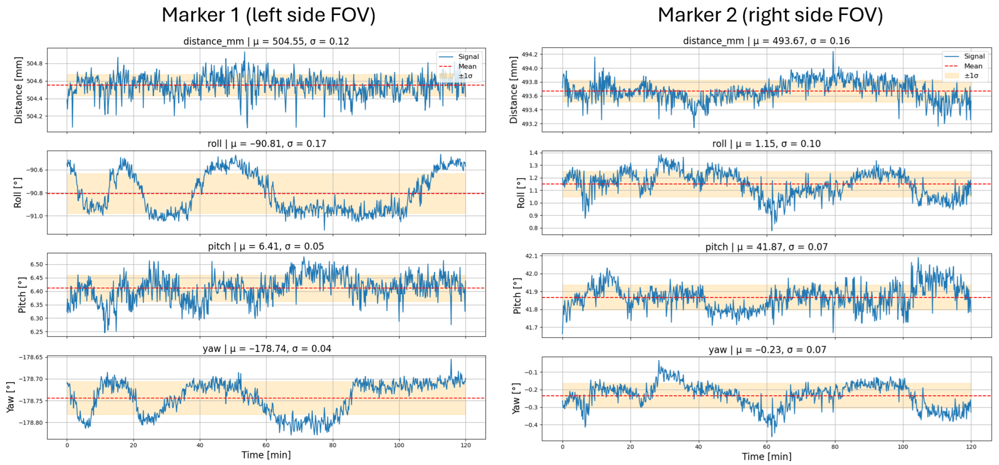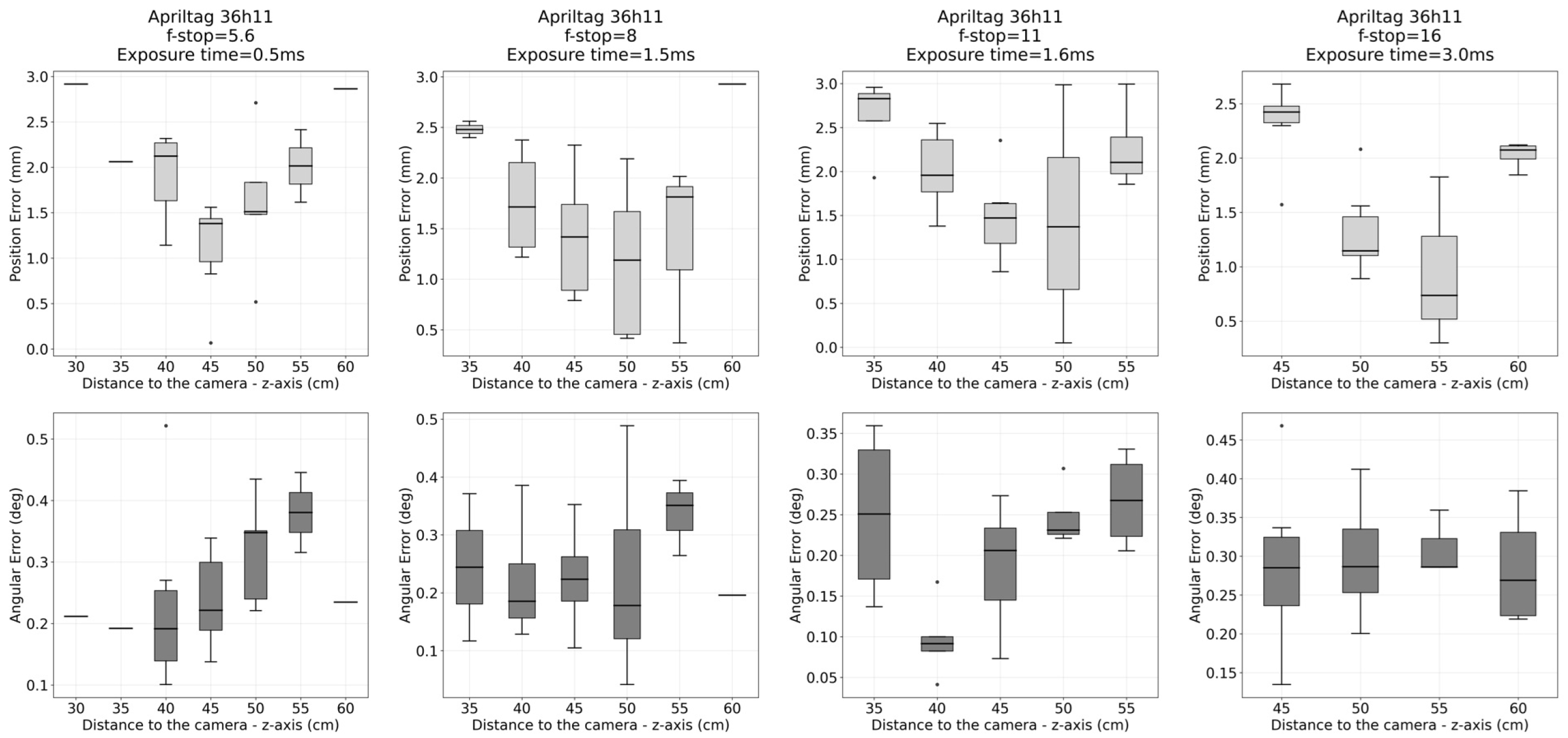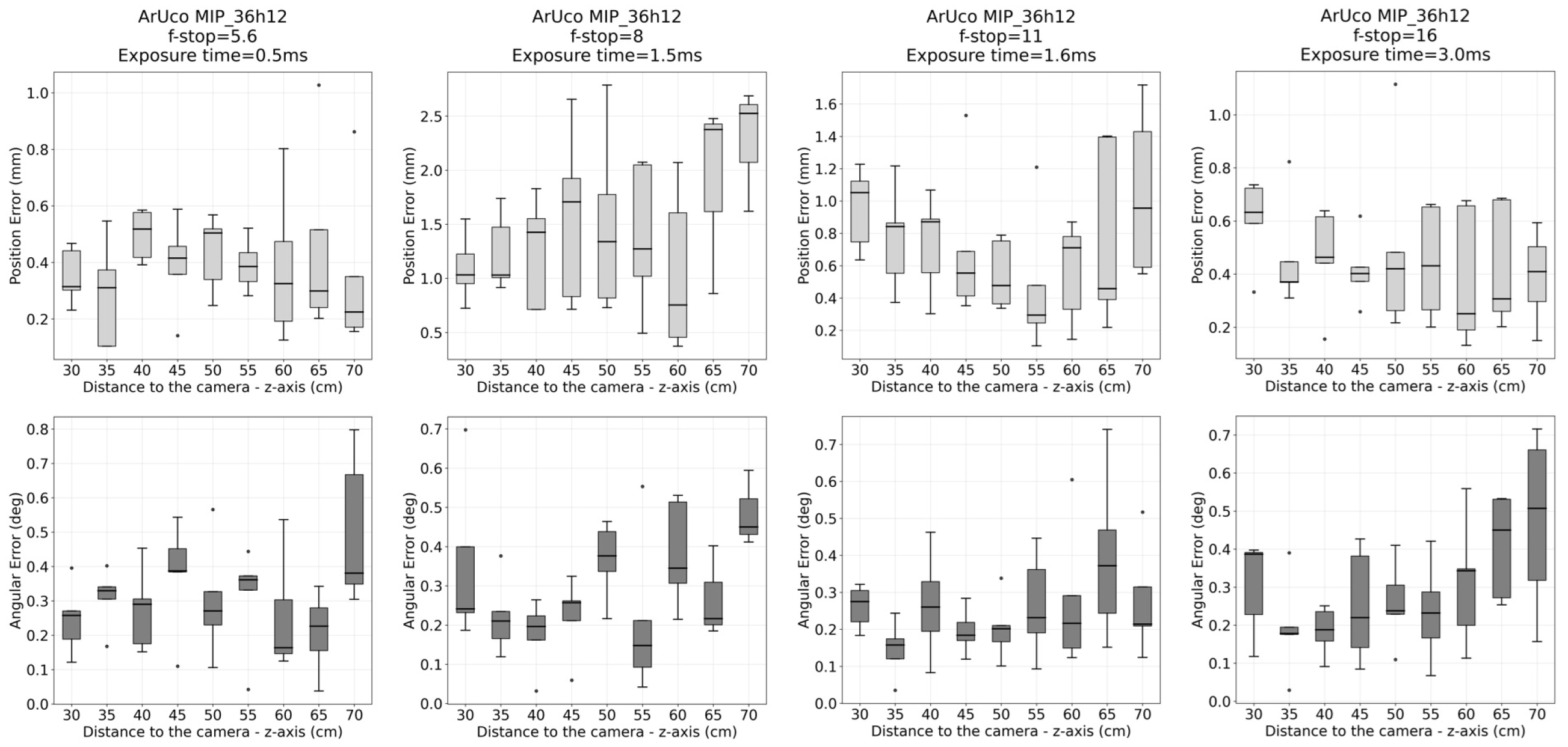 - The ArUco MIP_36h12 fiducial family offers the best performance, with translational errors of 0.44 ± 0.20 mm and rotational errors of 0.35 ± 0.16° at distances of 30–70 cm, as measured from static position estimates.