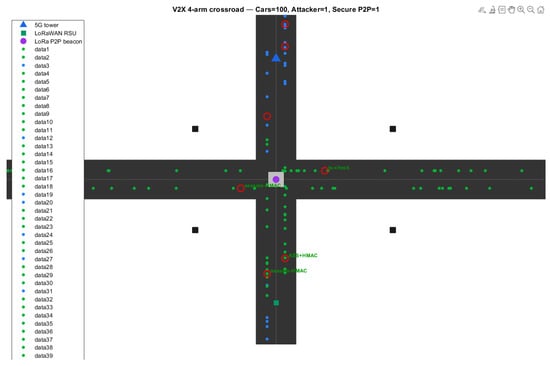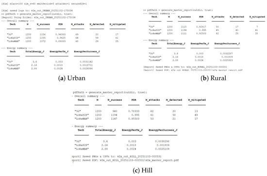 - A cross-domain experimental and simulation-based evaluation is performed by integrating encrypted real-time TPMS data into a MATLAB V2X simulation that scales to one hundred virtual vehicles operating in urban, rural, and hill environments. Comparative analysis across 5G, LoRaWAN, and LoRa P2P networks demonstrates that secure LoRa P2P achieves the highest packet-delivery reliability, energy efficiency, and resilience under attack conditions [14,15].