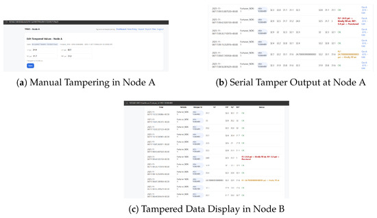 Figure 12. ThingSpeak validation plots. The coloured dots represent individual tyre-pressure measurements and the connecting lines show their evolution over time (timestamped samples on the horizontal axis). (a) Node B cloud view (insecure but authorized): tampered values appear as normal due to lack of cryptographic verification. (b) Node C cloud view (secure authorized): only AES-128 + HMAC-verified measurements are uploaded. (c) Node C_T tamper stream: red/flagged points indicate rejected packets, logged with timestamps and pseudonymous vehicle IDs for audit/forensics. Minor overlaps arise from dense time-series samples but do not affect the scientific interpretation, since the quantitative analysis relies on the underlying logged data rather than visual spacing.- Communication integrity: NodeC only spits out messages for which HMACs denote integrity, and Node B spits out anything it receives. The difference between Figure 12a,b illustrates the security bound introduced by–HMAC gate.