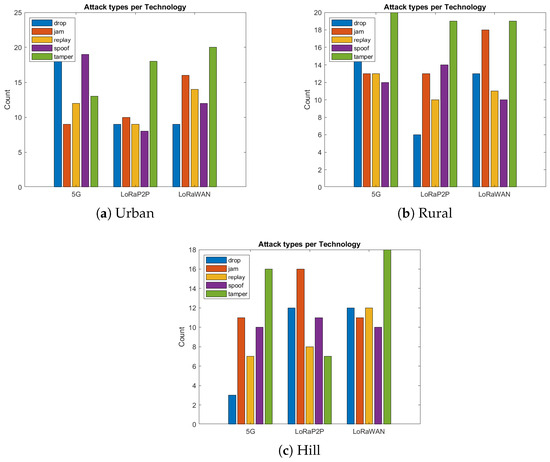 Attack type distributions. Urban networks face higher jamming/drop attacks, while hill environments suffer from replay/spoof dominance due to propagation delay.