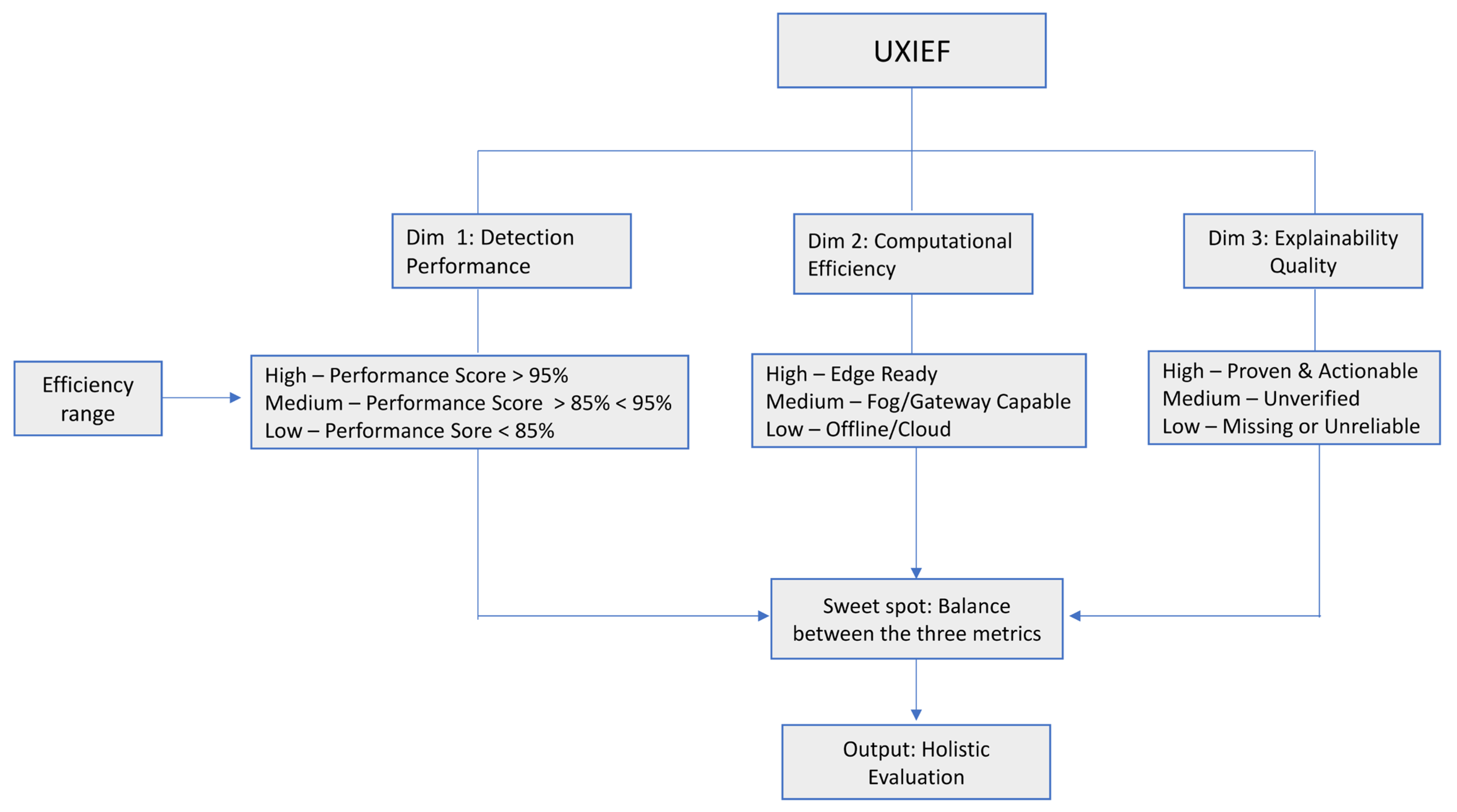 - To develop two conceptual frameworks: the XAI evaluation framework and the Unified Explainable IDS Evaluation Framework (UXIEF). The former is aimed at standardizing evaluation categories for XAI while the latter visually models the fundamental tensions between detection performance, resource efficiency, and explanation quality in IoT IDSs.