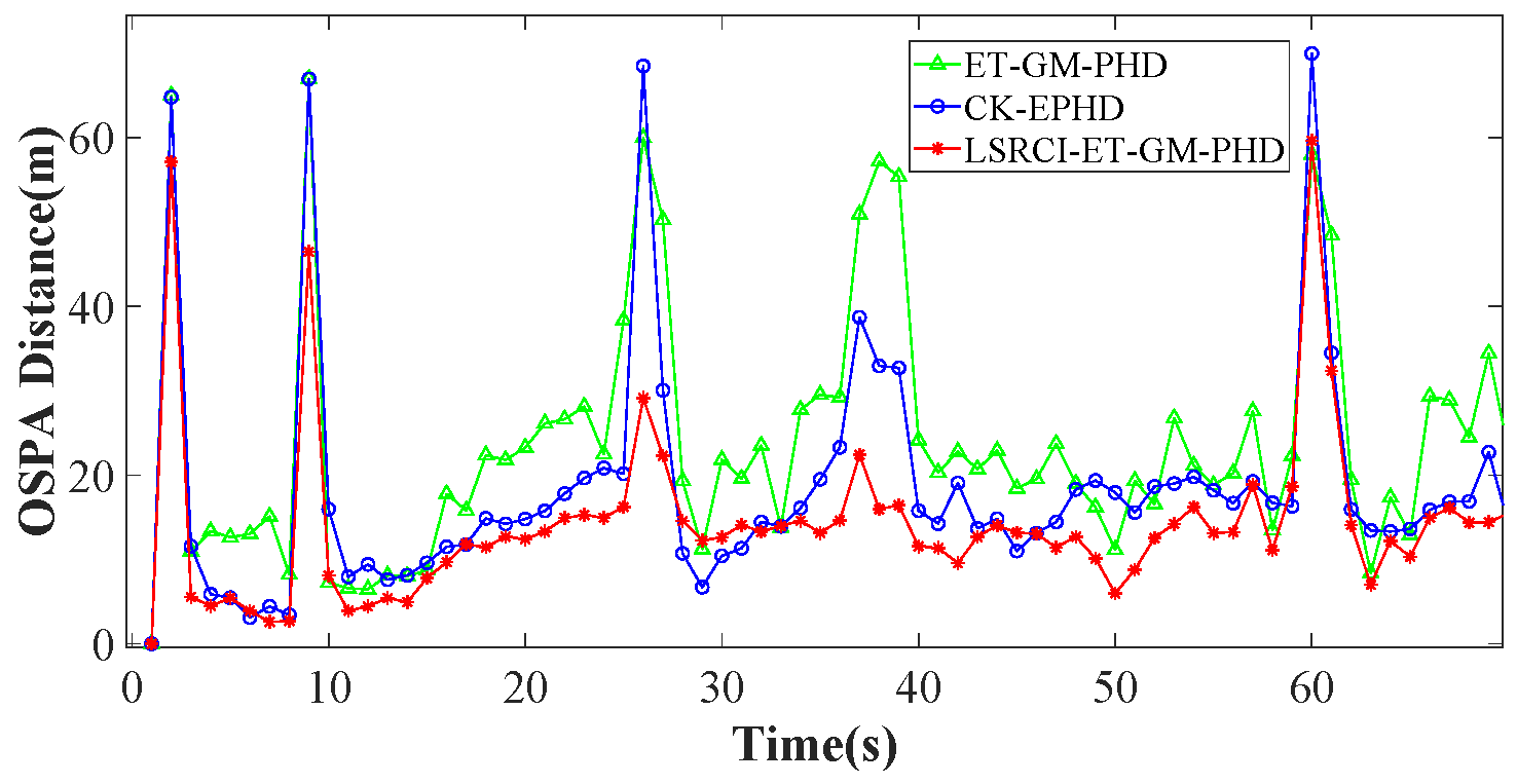 | OSPA(m) | 36.80 | 22.12 | 17.35 | 30.12 | 20.73 | 15.52 |