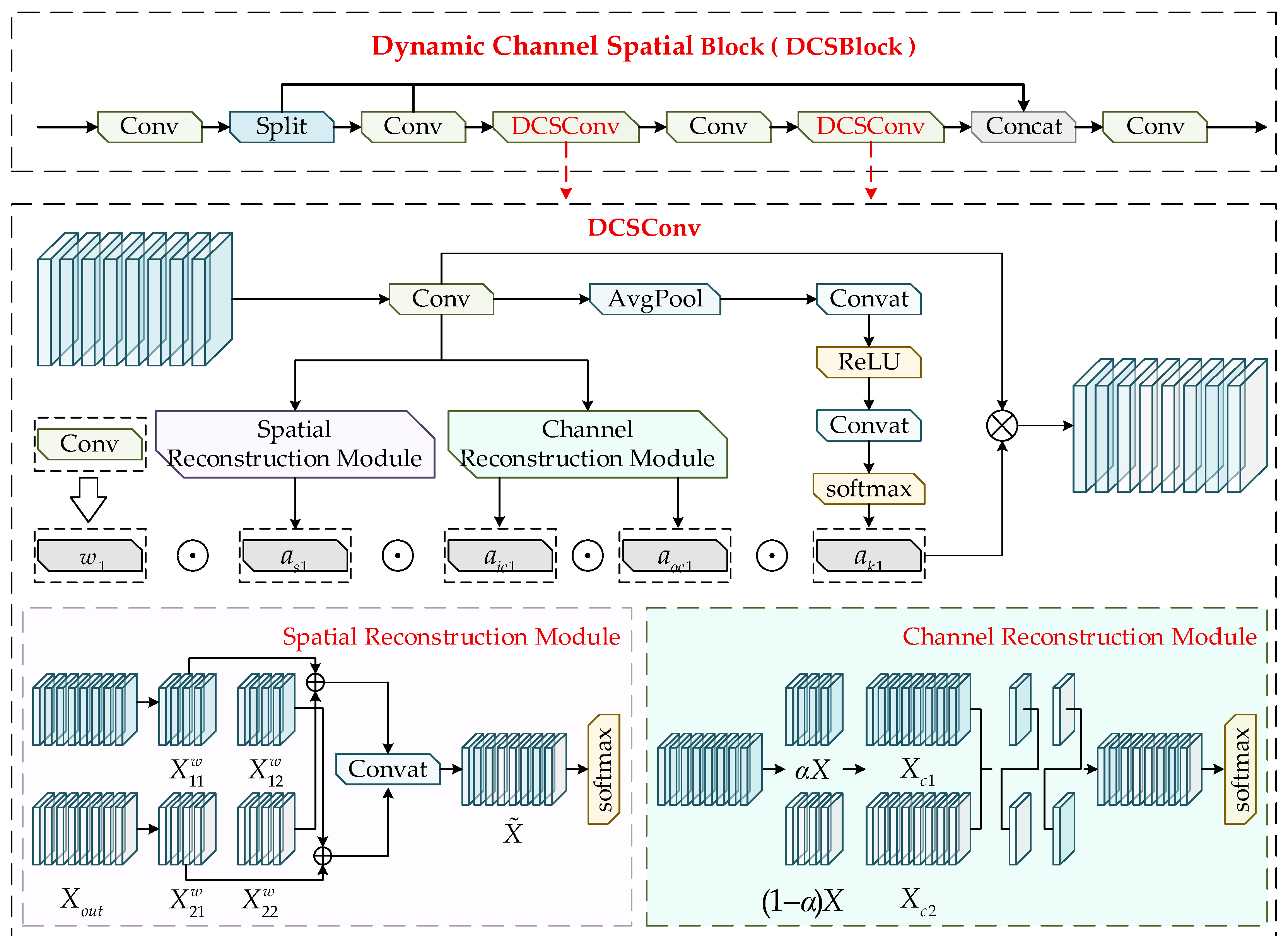 To reduce the redundancy introduced by conventional spatial and channel operations, this study incorporates a spatial–channel reconstruction mechanism to decrease model parameters and computational cost while enhancing feature representation capability. The structure of DCSConv consists of two components, the spatial reconstruction module and the channel reconstruction module, which are designed to eliminate redundancy during the feature extraction process.
