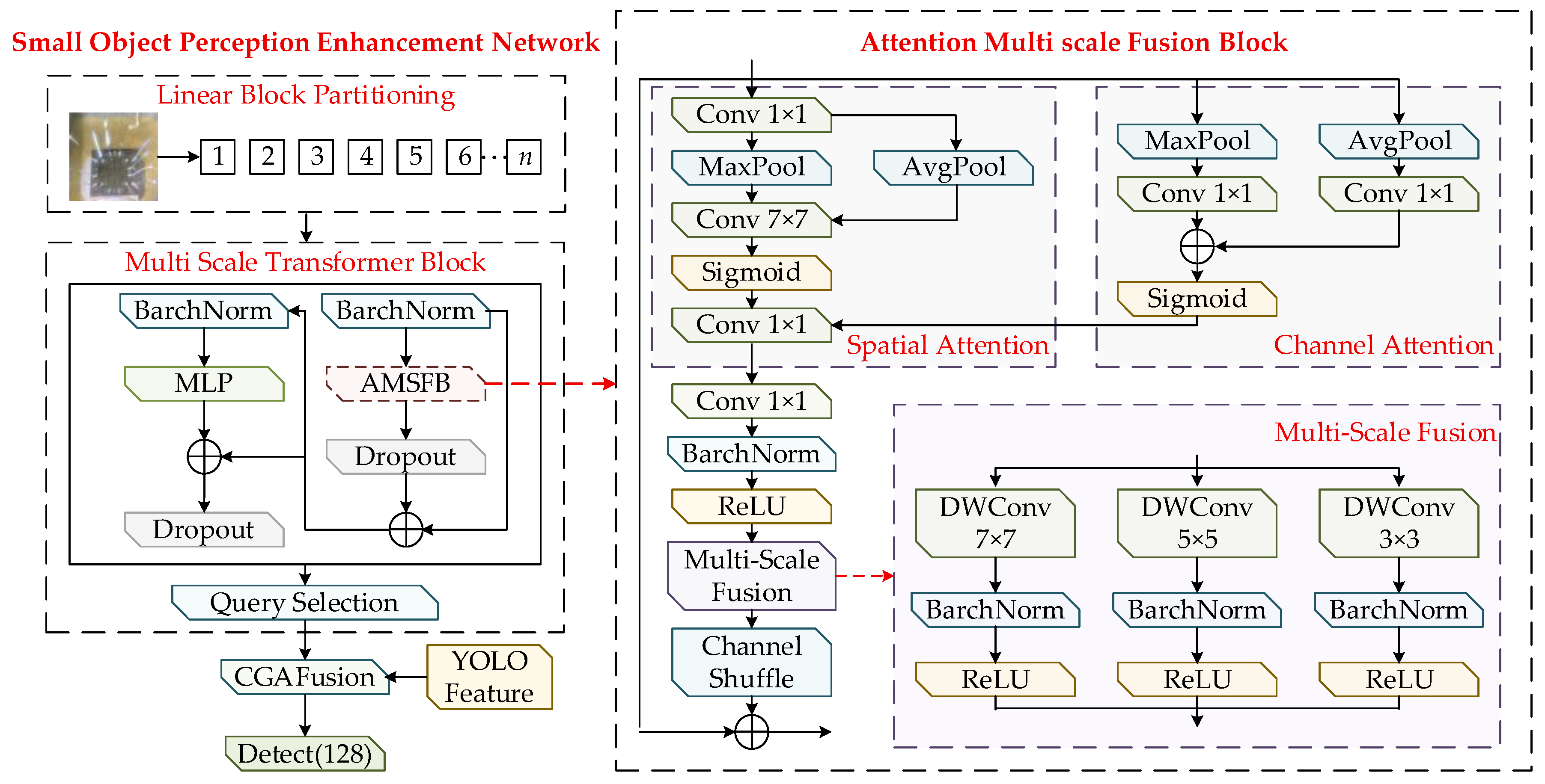 Significant differences exist in the visual characteristics of MEMS defects across different spatial scales. Large defects typically contain richer semantic structures and are more suitable for representation through high-level features, whereas small defects show extremely limited spatial extent and subtle texture details, requiring fine-grained depiction by low-level features with smaller receptive fields. If all features are extracted simultaneously at the full scale, it will not only increase the computational complexity of the network, but also may lead to feature redundancy, affecting the overall performance of the model. Considering the pronounced multi-scale properties of defects on MEMS device substrates, this study develops a small-object perception enhancement network based on the Transformer architecture [