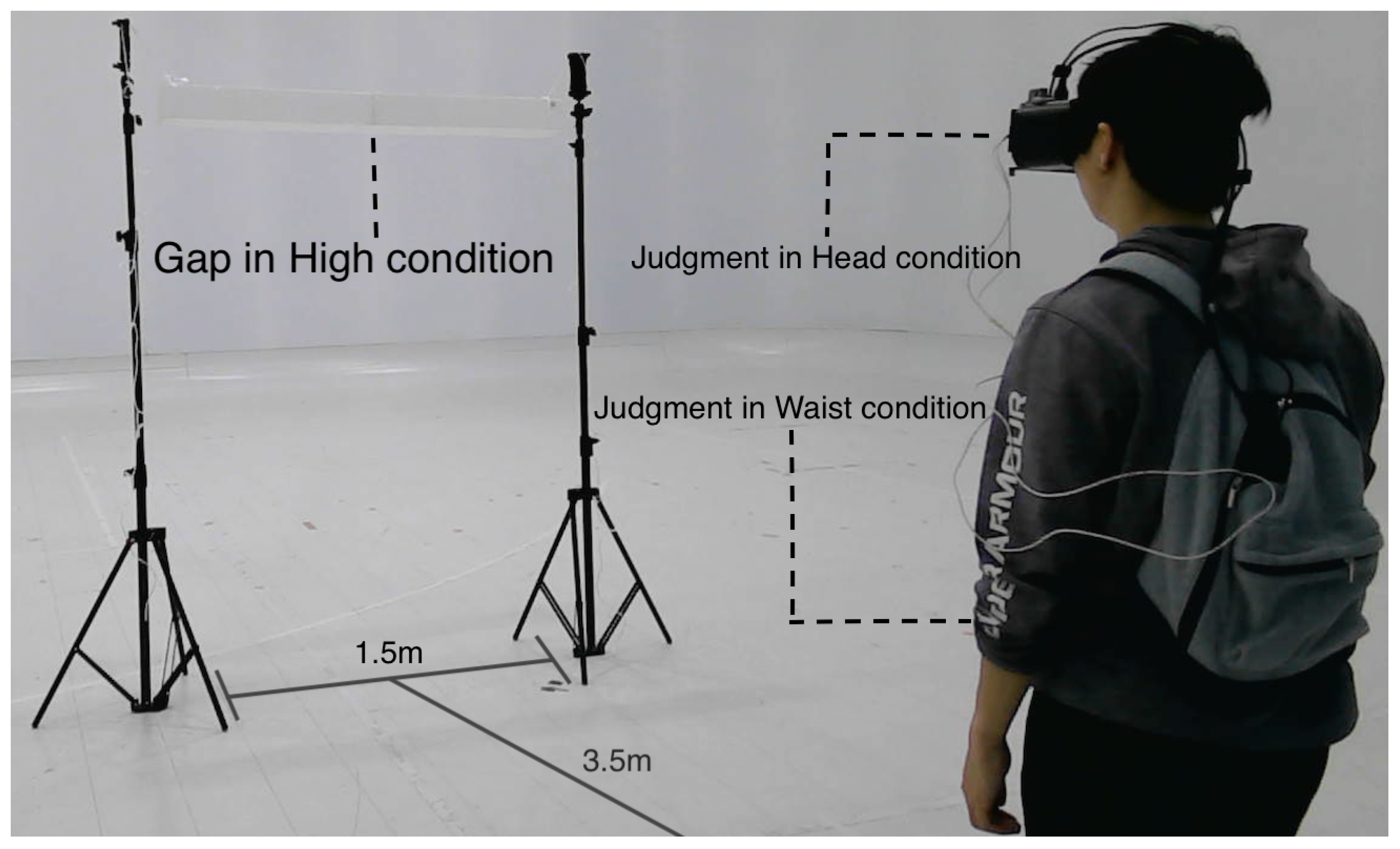The adjustable gap was formed by a white horizontal bar, whose height from the floor was set to one of three levels based on each participant’s standing height: high (above the participant’s standing height, a height allowing the participant to consistently pass under the bar without collision), middle (approximately chest height), and low (below the waist). The gap width (distance between the two stands) was approximately 1.5 m, and the bar height was adjustable in 30 cm increments; therefore, the realized bar heights were discretized to the nearest achievable level. Each participant experienced all six combinations of viewpoint (head, waist) and gap height (high, middle, low) in a pseudo-randomized order with a fixed constraint at the middle gap: head–middle was always performed before waist–middle.