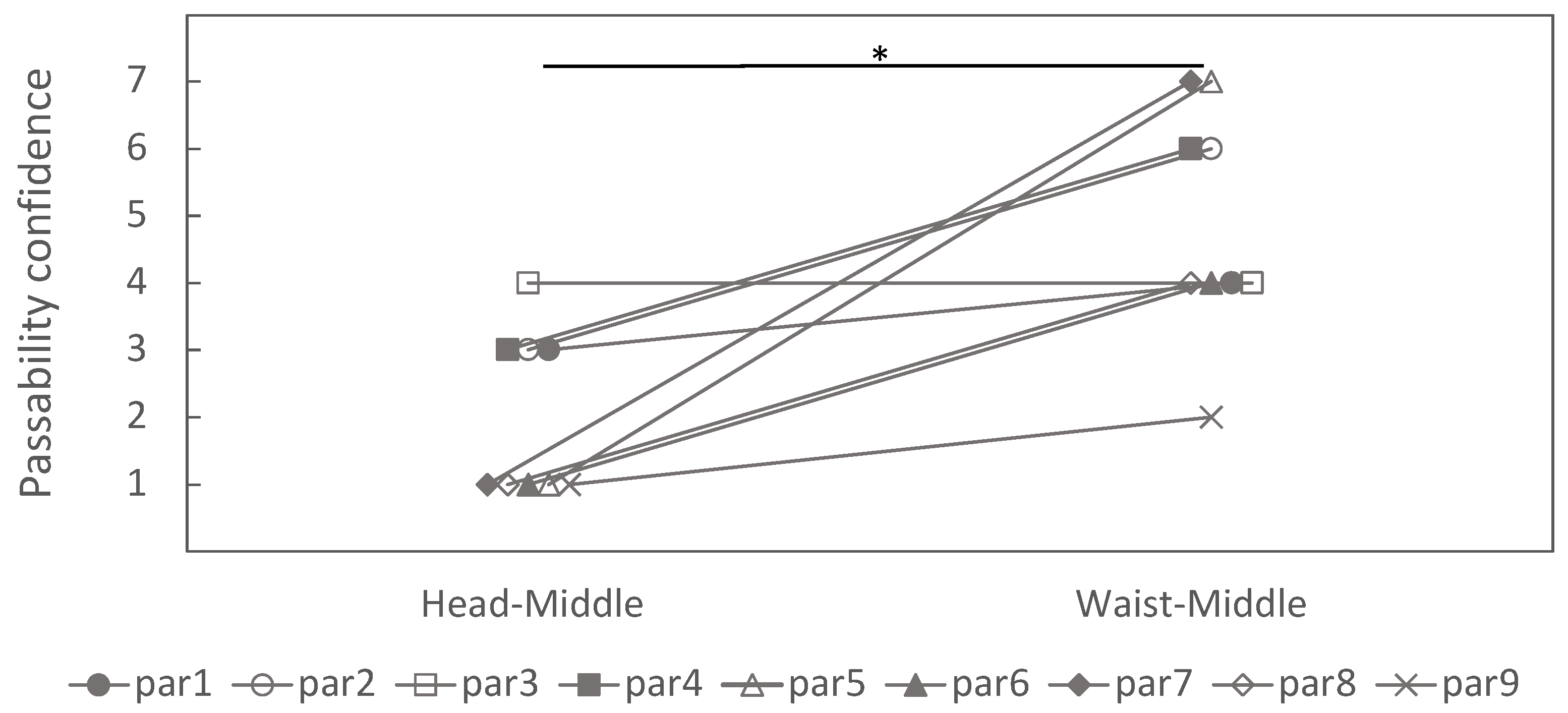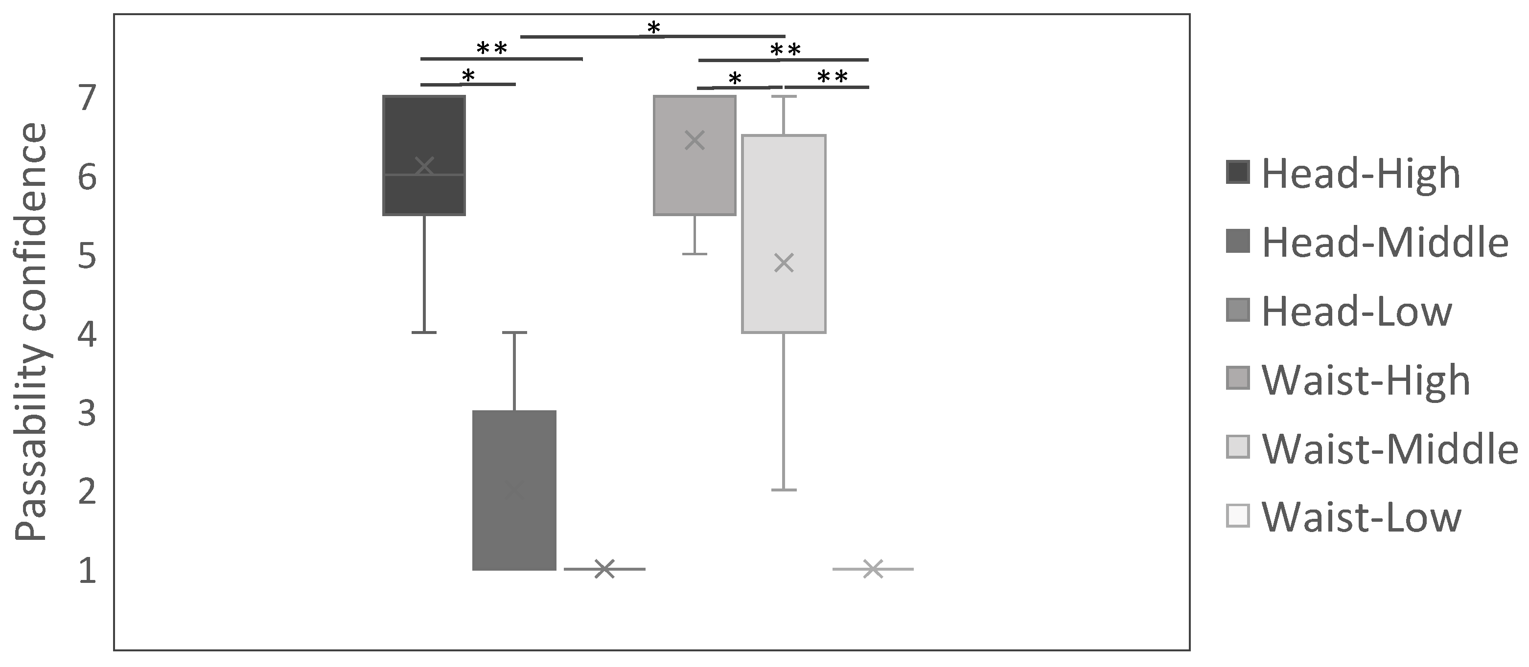 Figure 6, the high gap height was associated with high passability judgment and the low gap height with low judgment, regardless of viewpoint height. For example, at head–high and waist–high, all participants reported confidence