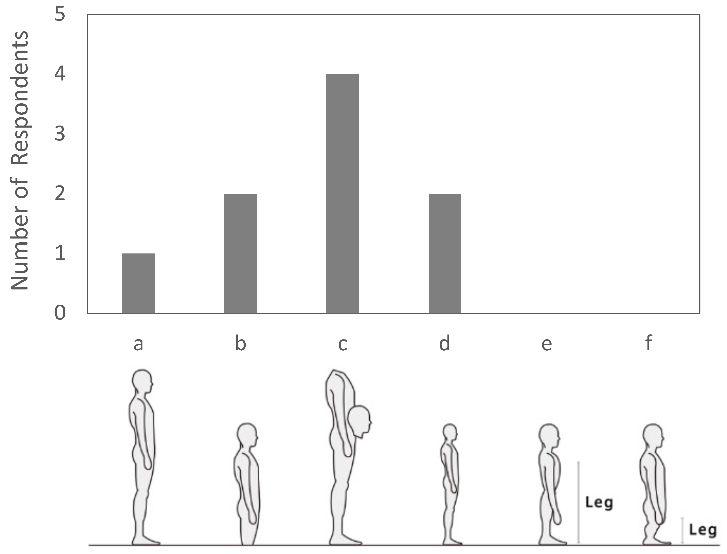 Figure 4), selecting the option that best matched their experience. For the body image questionnaire, participants chose one schematic from six options: (a) usual body, indicating no perceived change in dimensions; (b) grounded look, in which overall dimensions are preserved but the body feels lower or more anchored to the ground; (c) head near the waist, depicting a lowered head position relative to the torso (repositioning only, segment lengths unchanged); (d) isotropic (proportional) shrinkage, where all linear dimensions are scaled by the same factor; (e) uniform vertical shrinkage, where the overall body height decreases while the relative proportions between the upper and lower body are preserved, and the torso thickness in the sagittal plane remains unchanged; and (f) disproportionate leg shortening, in which the legs appear shorter relative to the upper body compared with (e). To minimize ambiguity, (d) preserves the original aspect ratio, and (f) shortens only the leg segment.