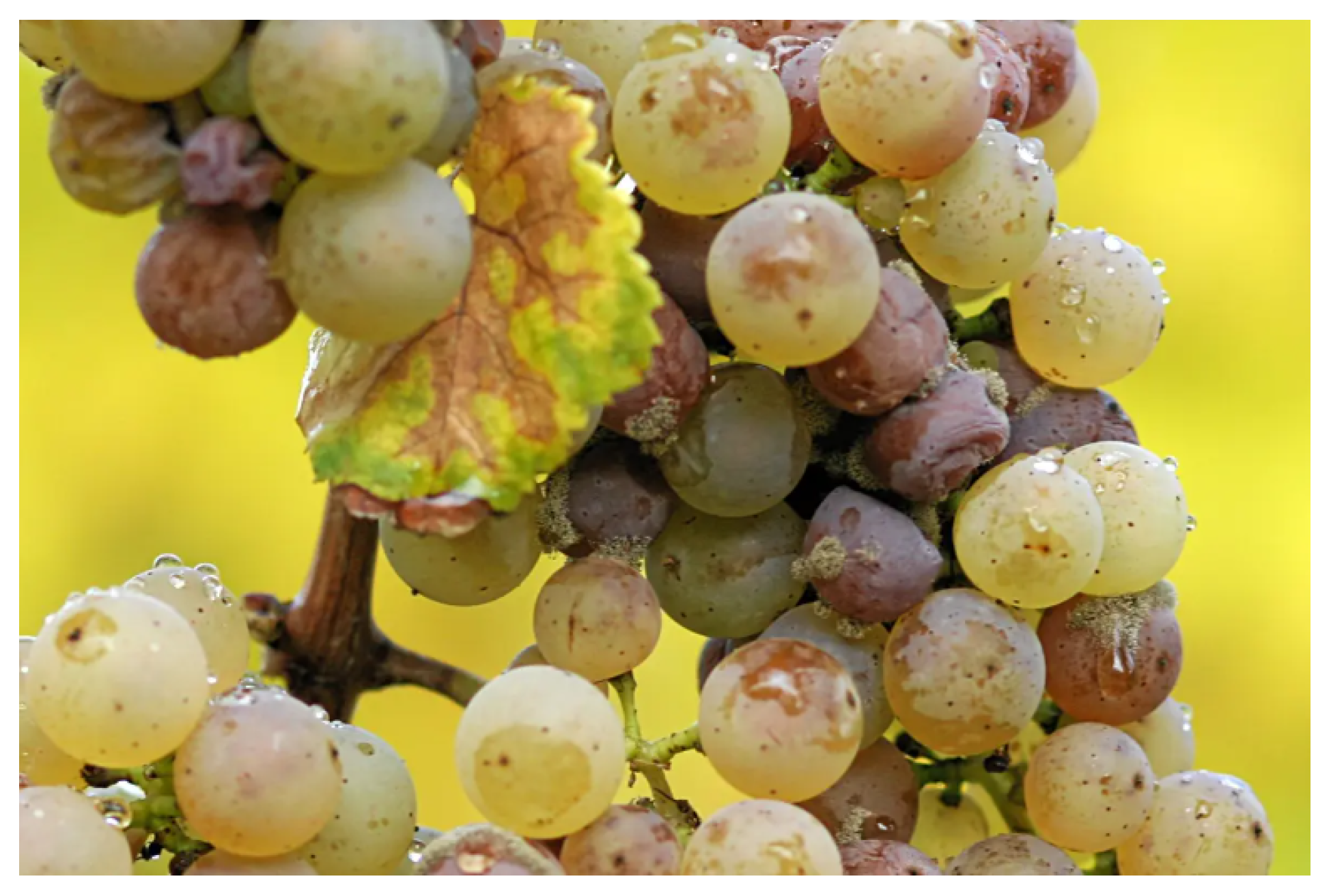 Figure 1 shows a bunch of grapes on a vine affected by Botrytis fungus.