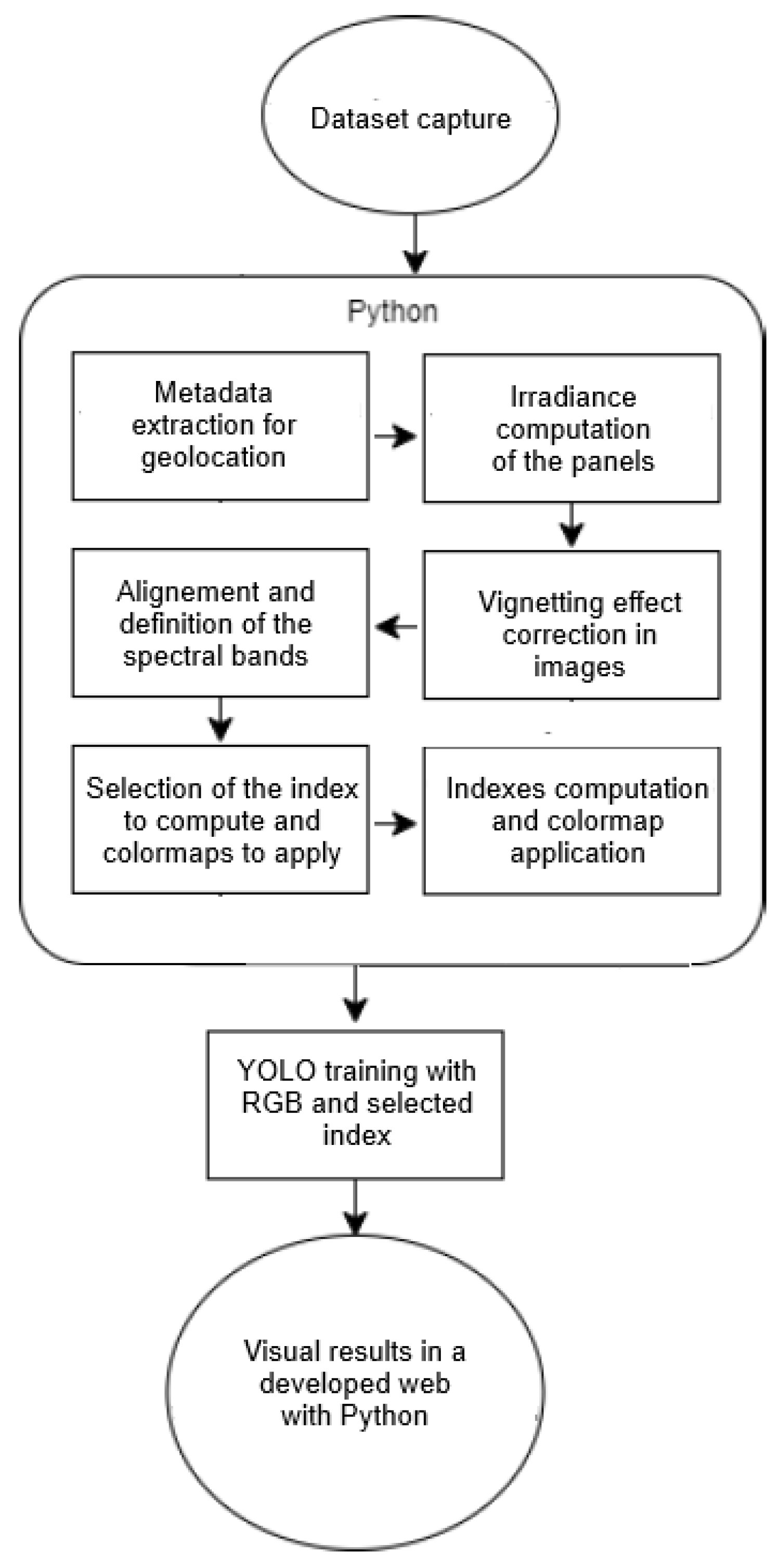 Figure 2 presents a summary of this description of the combination of technologies to help the agricultural sector advance in the battle against potential problems in agriculture. By systematically comparing RGB imagery with chlorophyll-absorption–based indices under identical detection architectures, the study evaluates the contribution of physiologically informed spectral features to detection accuracy. The resulting framework produces spatially explicit, geolocated detections with near real-time inference capability, aligning with the requirements of precision viticulture and sensor-driven crop monitoring.