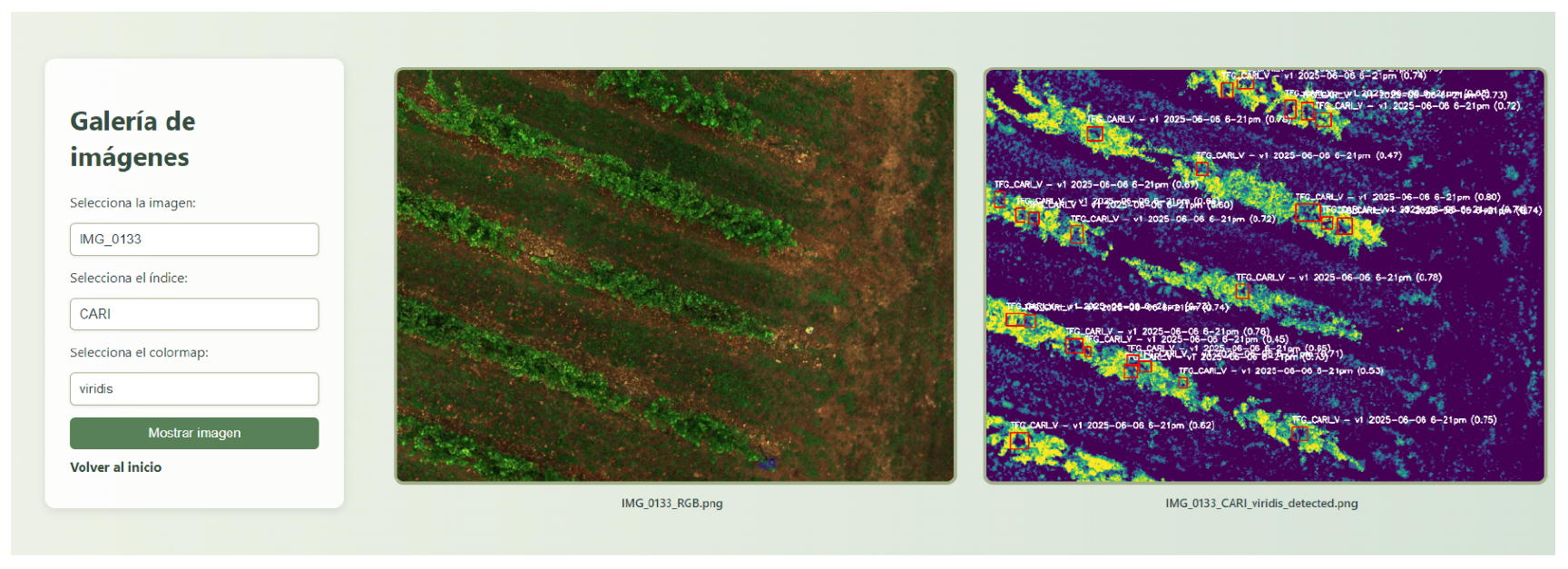 21] and Flask-SQLAlchemy for database management. The platform allows users to visualize both raw RGB images and processed vegetation index layers, along with YOLO-based detection overlays. Public users can access limited visualizations, while registered users can query complete datasets for advanced analysis.